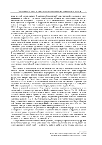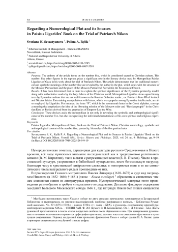В фокусе внимания авторов статьи – число пять – священное в христианской культуре. Обращение к нему, как и к другим цифрам первого десятка – один из литературных приемов Газского митрополита Паисия Лигарида в книге о суде над патриархом Никоном. Показано, что традиционное цифровое и символическое значение пятерки раскрывается полемистом в сюжете об устроении Московского Патриархата и месте Московской патриаршей кафедры во Вселенской Церкви. Установлено, что для объяснения духовного значения византийской модели пентархии наряду с авторитетными в христианском мире произведениями святых отцов Лигарид привлекает слабо знакомые русскому православному читателю литературные тексты византийских авторов, которые помогают митрополиту не только раскрыть символико-антропологическое содержание числа пять, но и выразить индивидуальные особенности собственного духовно-религиозного опыта.