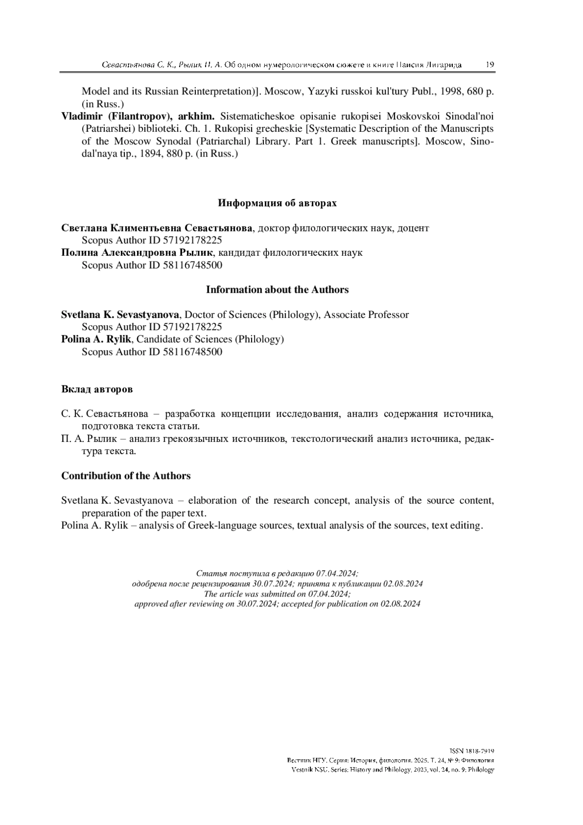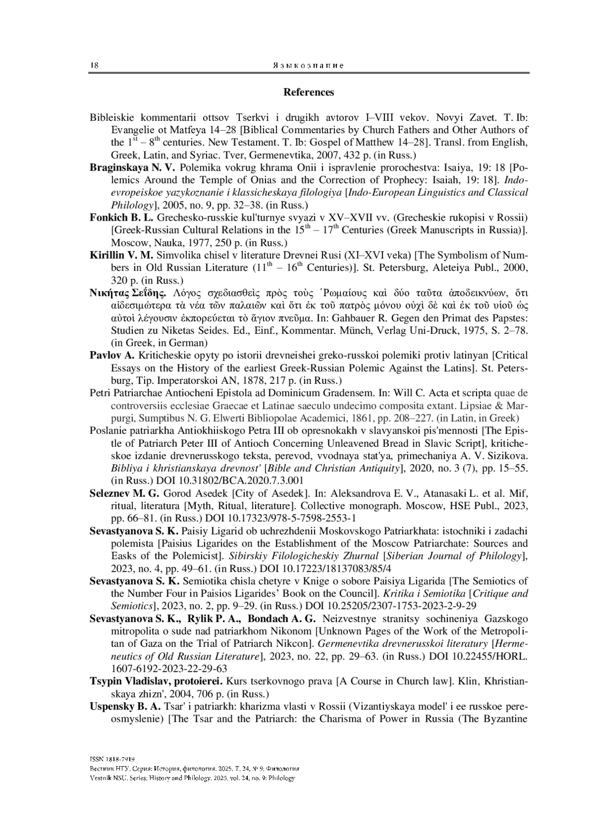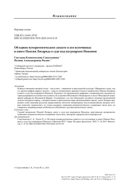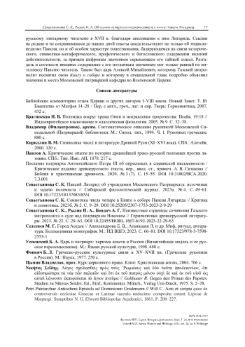 7. Севастьянова С. К. Паисий Лигарид об учреждении Московского Патриархата: источники и задачи полемиста // Сибирский филологический журнал. 2023а. № 4. С. 49-61. https://doi.org/10.17223/18137083/85/4