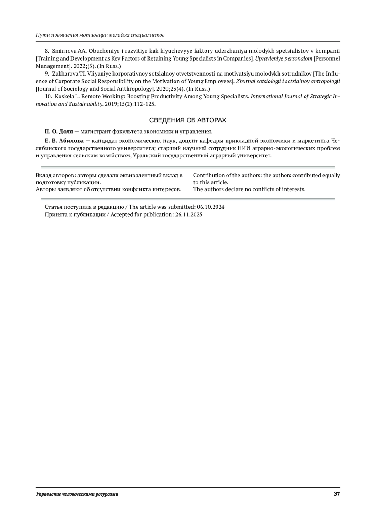 8. Смирнова А. А. Обучение и развитие как ключевые факторы удержания молодых специалистов в компании // Управление персоналом. 2022. № 5.
