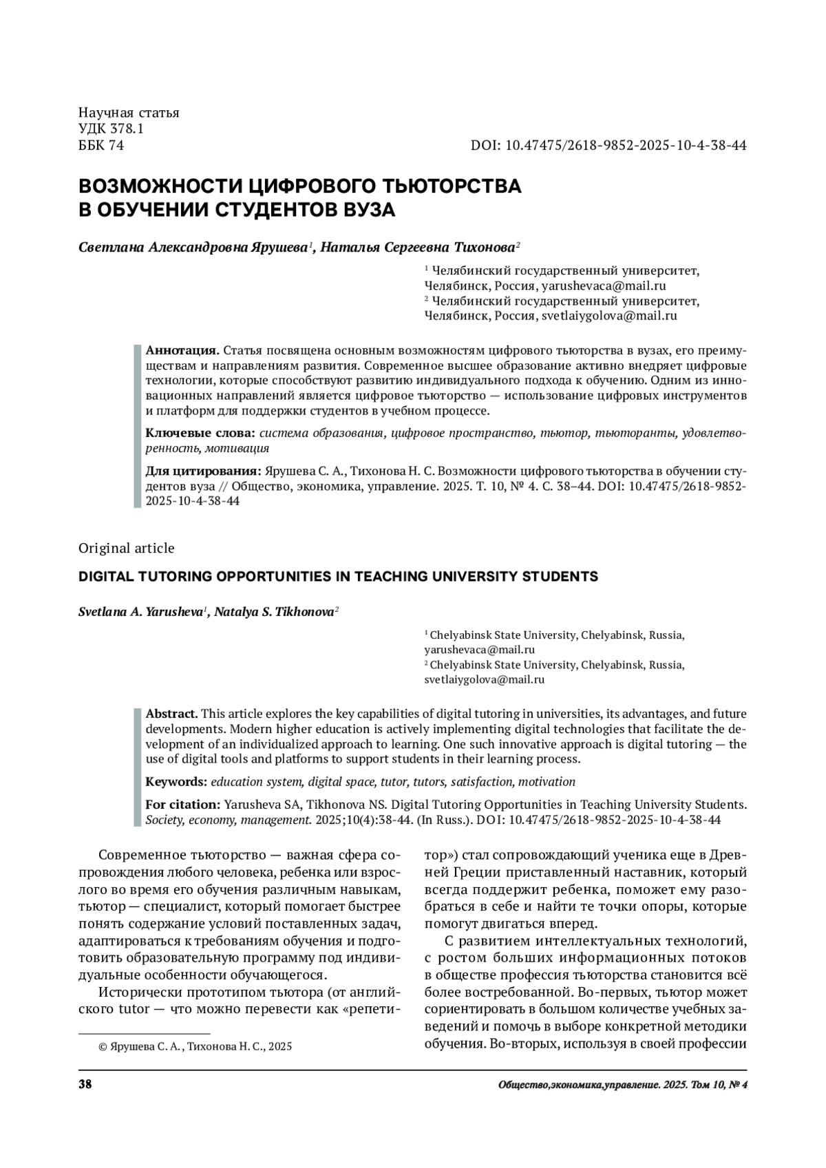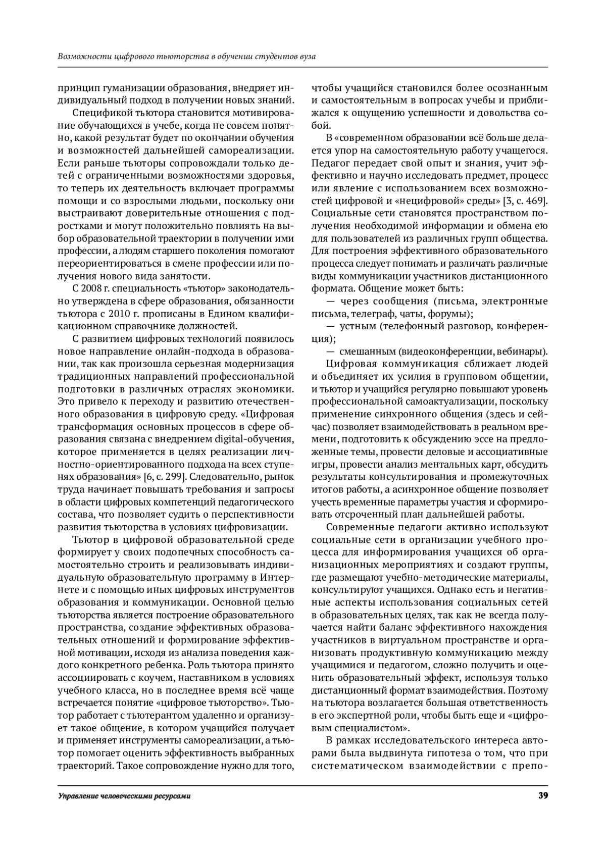 Статья посвящена основным возможностям цифрового тьюторства в вузах, его преимуществам и направлениям развития. Современное высшее образование активно внедряет цифровые технологии, которые способствуют развитию индивидуального подхода к обучению. Одним из инновационных направлений является цифровое тьюторство - использование цифровых инструментов и платформ для поддержки студентов в учебном процессе.