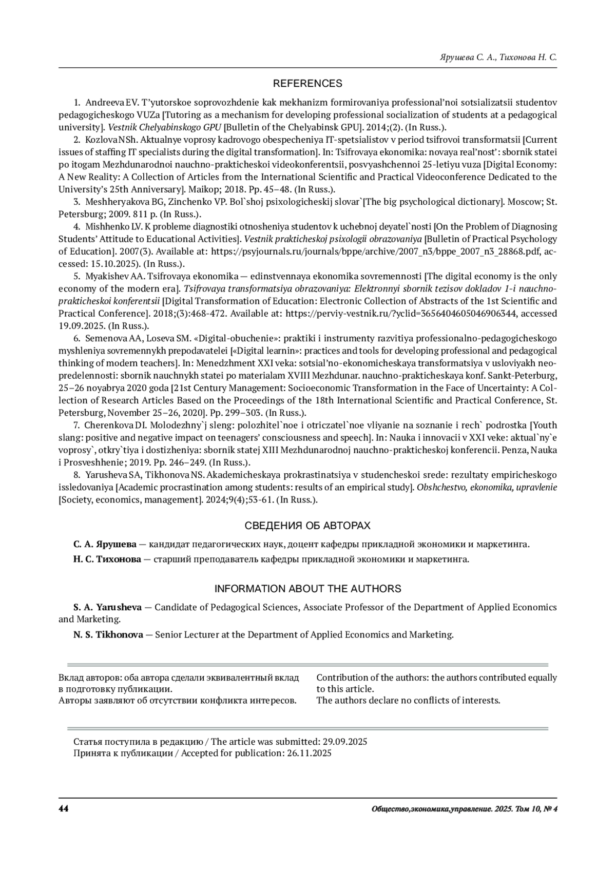 8. Ярушева С. А., Тихонова Н. С. Академическая прокрастинация в студенческой среде: результаты эмпирического исследования // Общество, экономика, управление. Челябинск, 2024. Т. 9, № 4. С. 53-61.