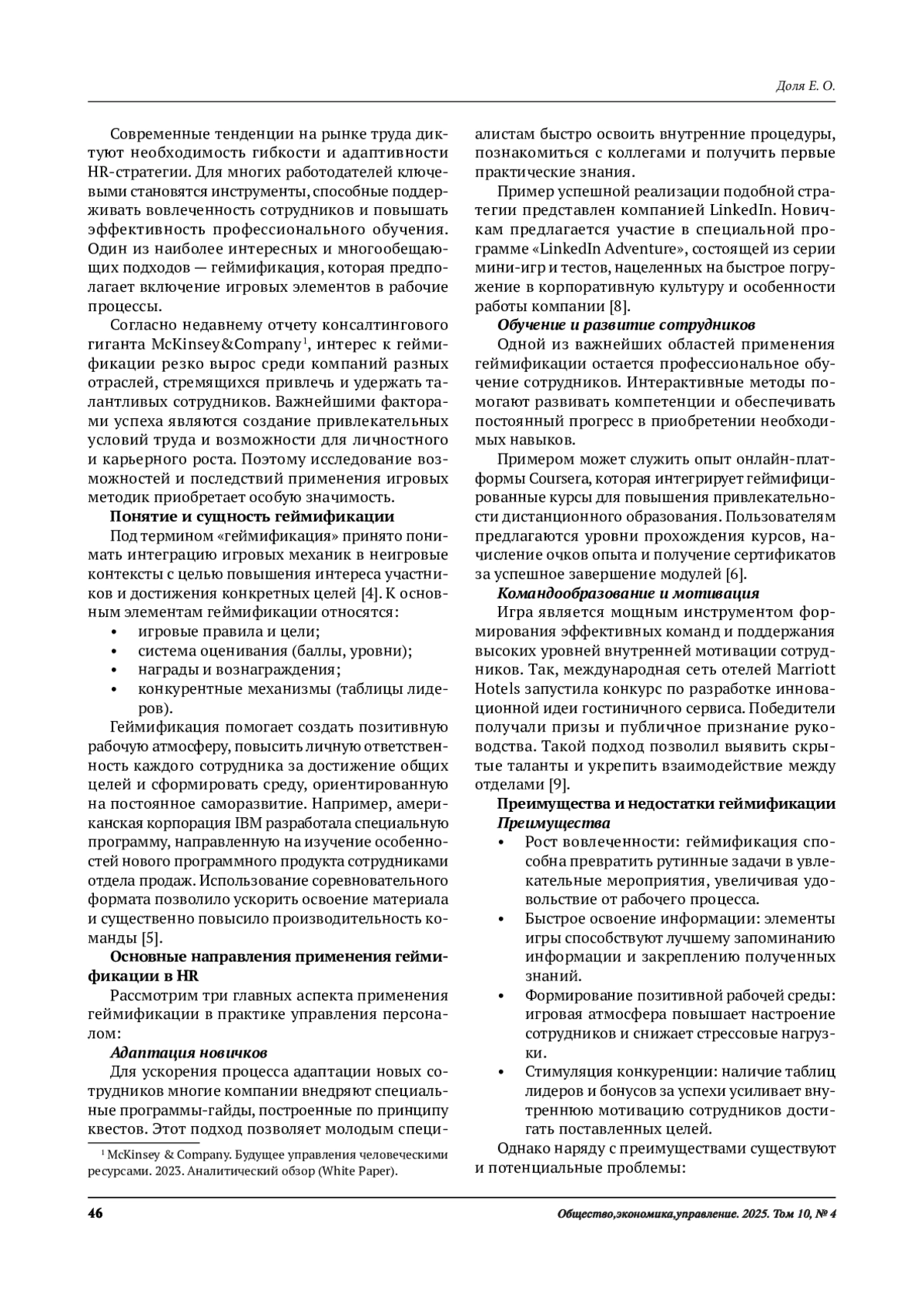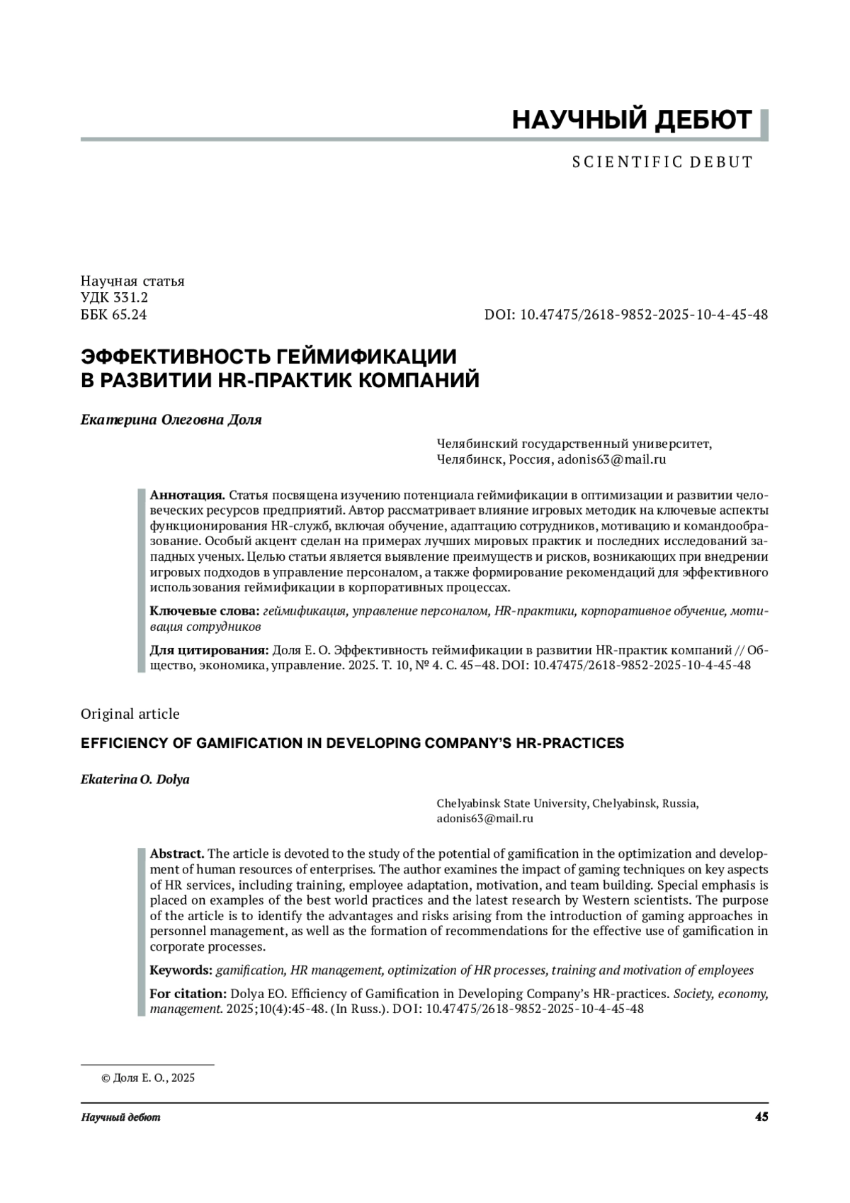 Статья посвящена изучению потенциала геймификации в оптимизации и развитии человеческих ресурсов предприятий. Автор рассматривает влияние игровых методик на ключевые аспекты функционирования HR-служб, включая обучение, адаптацию сотрудников, мотивацию и командообразование. Особый акцент сделан на примерах лучших мировых практик и последних исследований западных ученых. Целью статьи является выявление преимуществ и рисков, возникающих при внедрении игровых подходов в управление персоналом, а также формирование рекомендаций для эффективного использования геймификации в корпоративных процессах.