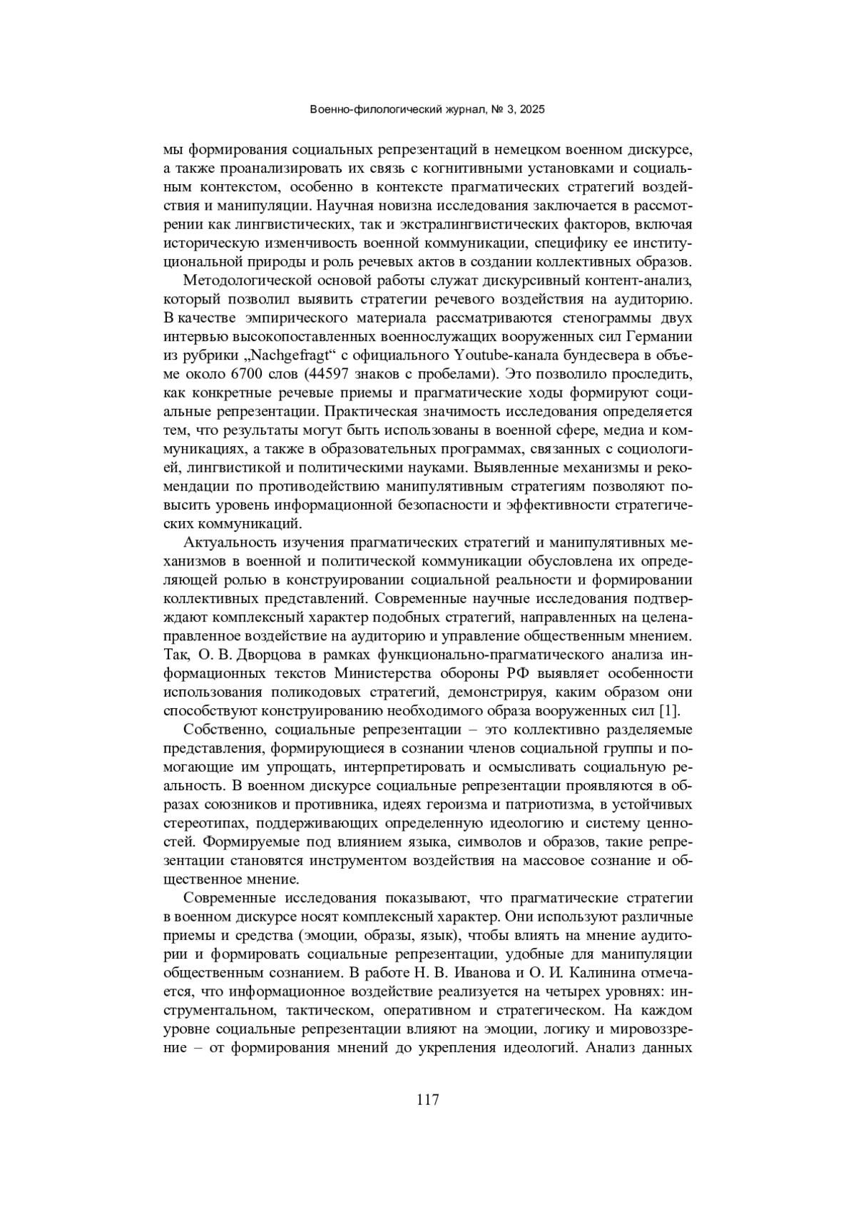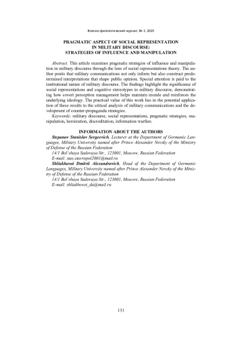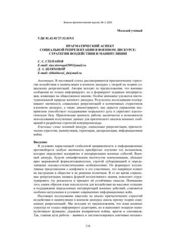 В настоящей статье рассматриваются прагматические стратегии воздействия и манипуляции в военном дискурсе с опорой на теорию социальных репрезентаций. Авторы исходят из предположения, что военные сообщения не только информируют, но и формируют заданные интерпретации, влияющие на общественное мнение. Особое внимание уделяется институциональной природе военного дискурса. Результаты исследования подчеркивают значимость социальных репрезентаций и когнитивных стереотипов в военном дискурсе, а также демонстрируют, как скрытое управление восприятием способствует поддержанию морального духа и укрепляет идеологическую базу. Практическая ценность работы заключается в возможности использования полученных данных для критического анализа военных сообщений и разработки стратегий контрпропаганды.