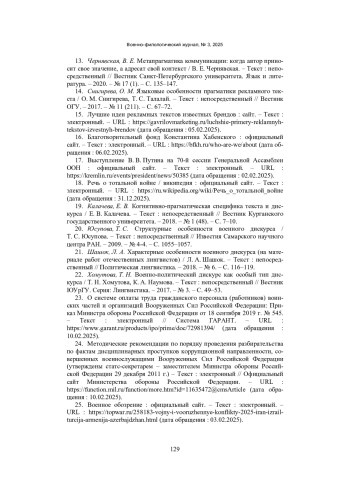 1. Дворцова, О. В. Функционально-прагматические характеристики современного медиатекста (на материале информационного бюллетеня Министерства обороны Российской Федерации) / О. В. Дворцова. - Текст: непосредственный // Военно-филологический журнал. - 2024. - № 4. - С. 84-94. EDN: CLJOGI
