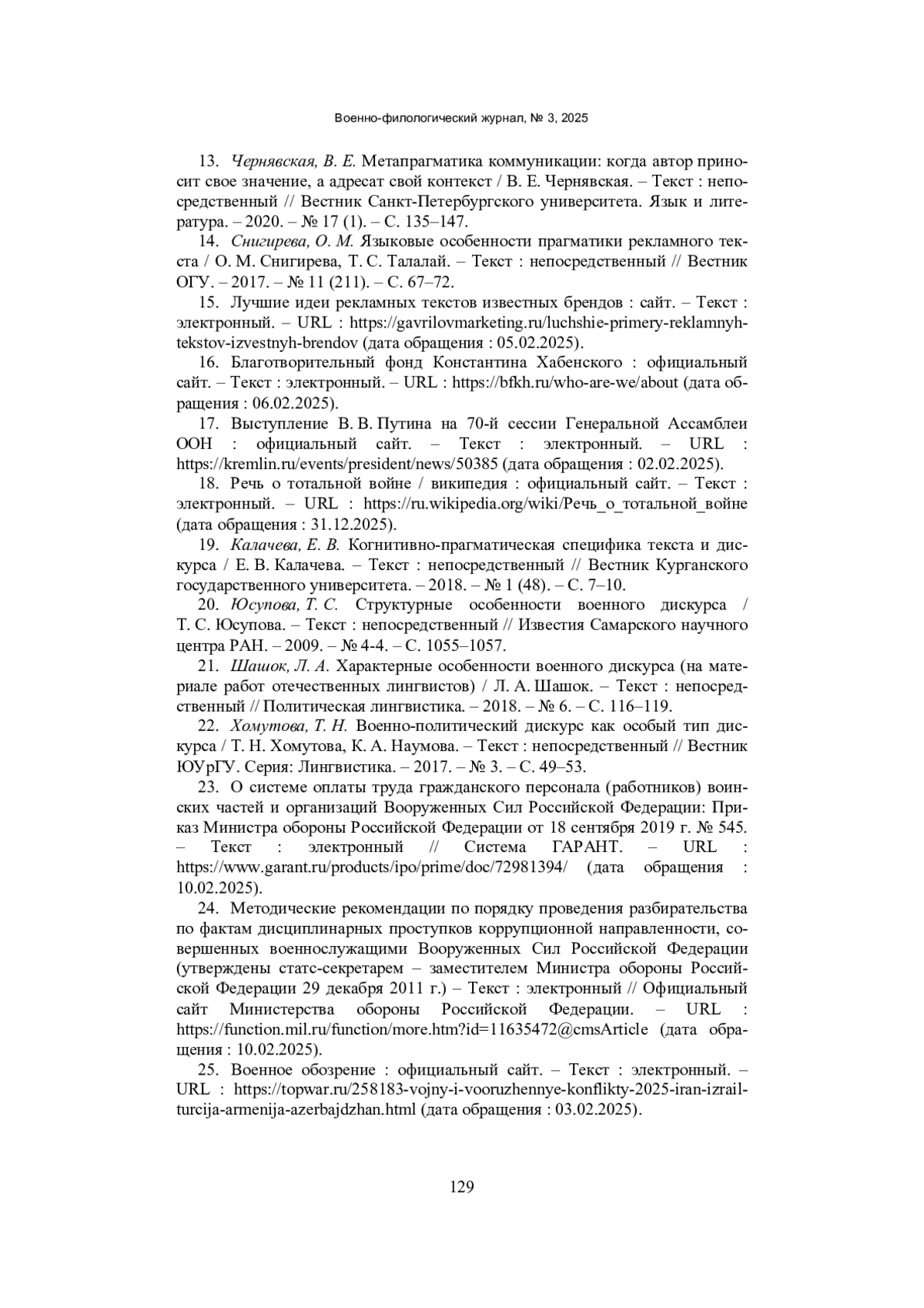 27. Уланов, А. В. Коммуникативные стратегии в военном дискурсе / А. В. Уланов. - Текст: непосредственный // Сибирский филологический журнал. - 2014. - № 4. - С. 99-109. EDN: TAKBMH