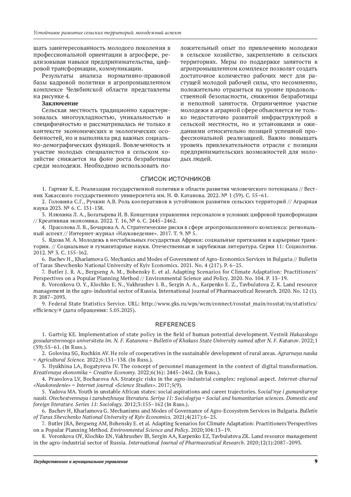 8. Voronkova O. Y., Klochko E. N., Vakhrushev I. B., Sergin A. A., Karpenko E. Z., Tavbulatova Z. K. Land resource management in the agro-industrial sector of Russia.International Journal of Pharmaceutical Research. 2020. No. 12 (1). Р. 2087-2093. EDN: EOLCIB