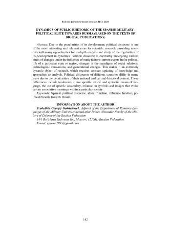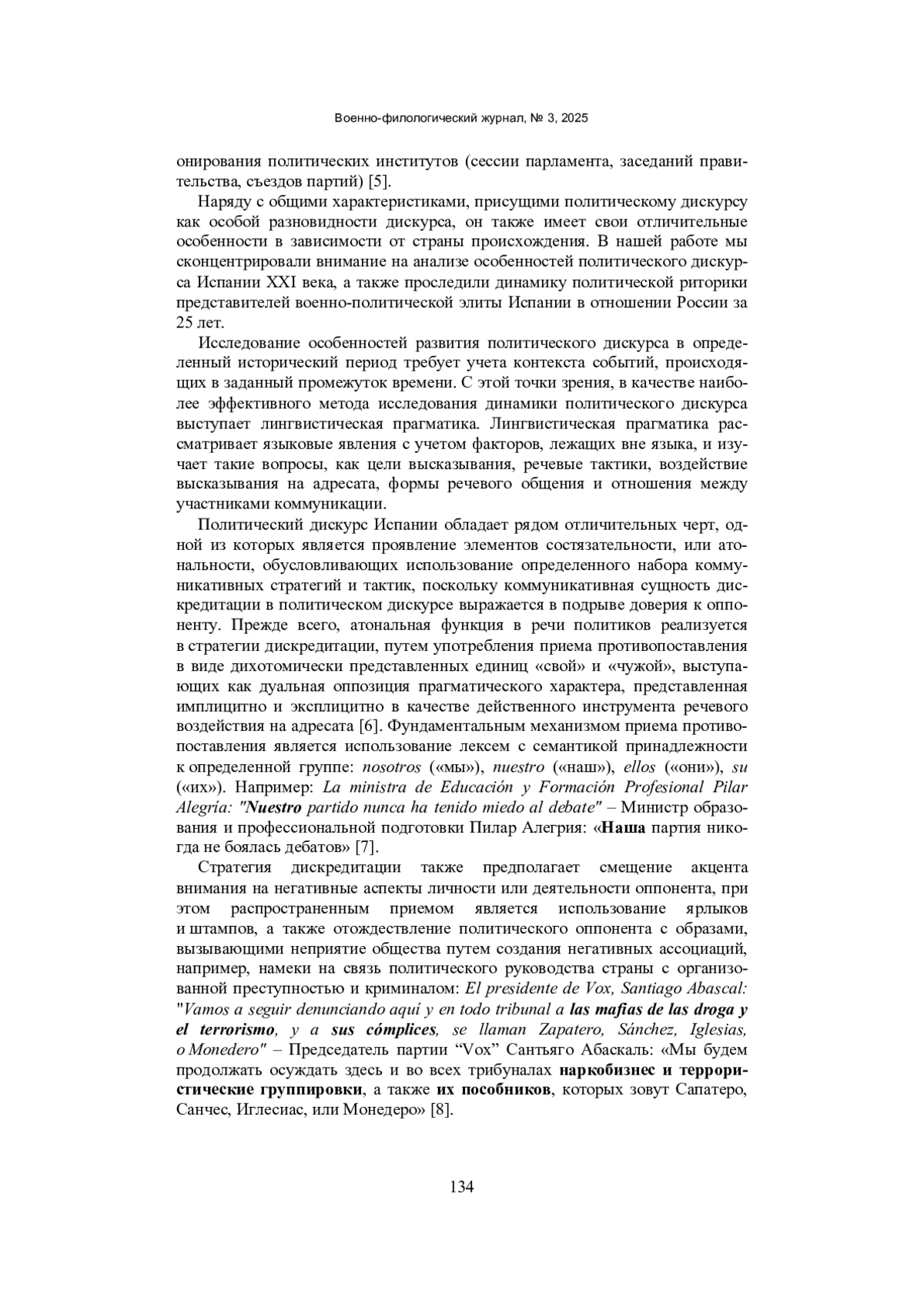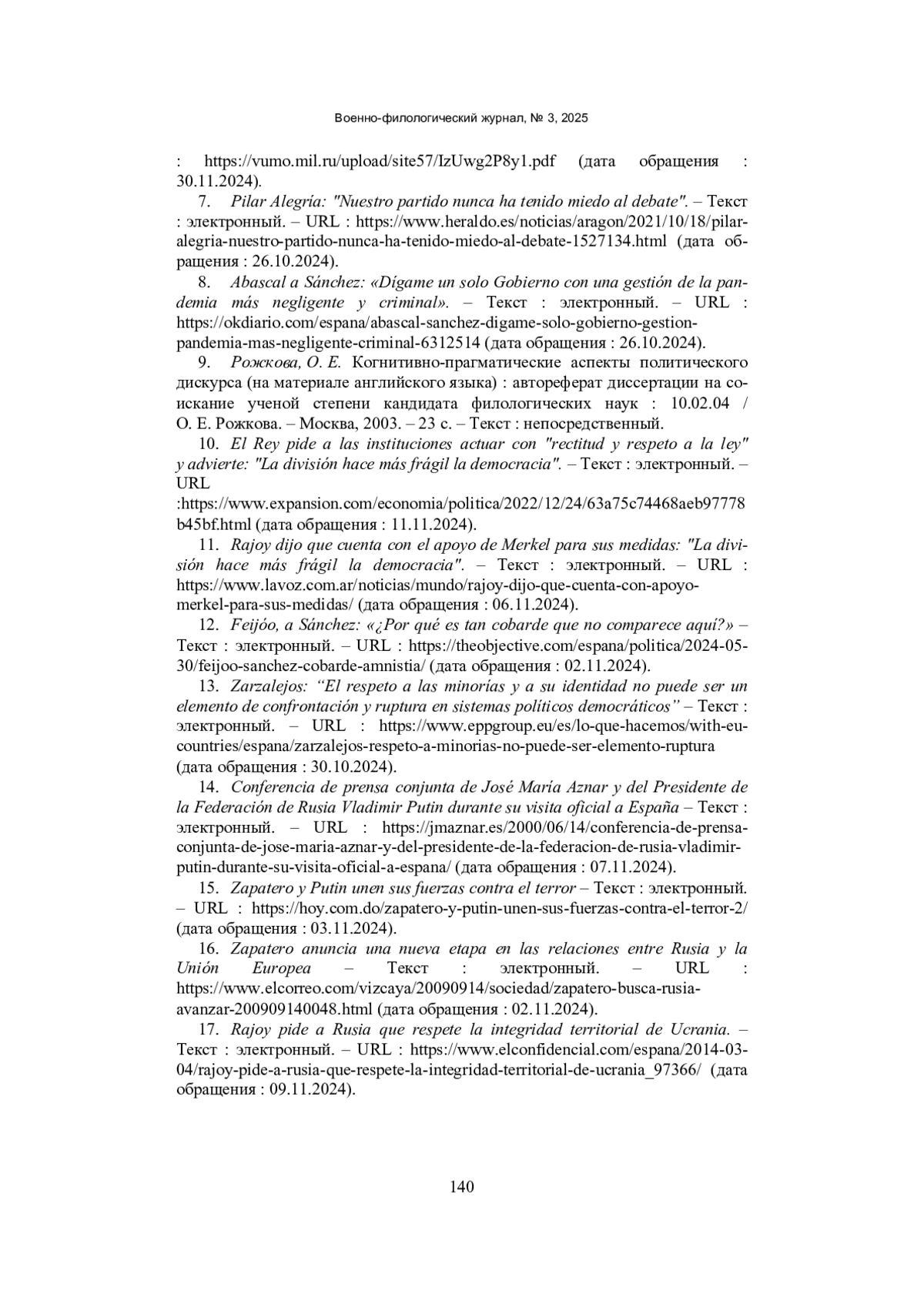 6. Зененко, Н. В. Лингвопрагматическое описание военно-политического медиадискурса: опыт системного анализа / Н. В. Зененко, О. А. Червякова. - Текст: электронный // Военно-филологический журнал. - 2023. - № 3. - URL: https://vumo.mil.ru/upload/site57/IzUwg2P8y1.pdf (дата обращения: 30.11.2024). EDN: GVVOQQ