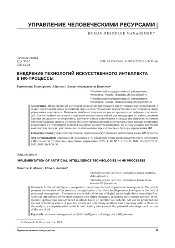 Искусственный интеллект полностью преобразует сферу управления персоналом. В статье представлен обзор тенденций применения технологий искусственного интеллекта в сфере управления персоналом. Выявлены наиболее актуальные риски применения цифровых технологий. Искусственный интеллект предлагает множество решений для менеджеров по найму, включая базовые инструменты рекрутинга, промежуточные приложения и передовые решения на основе интеллектуальных систем. Cистемы ИИ могут прогнозировать и обучаться, строя кривые возможных результатов и оптимизируя решения на основе множества критериев. На основе анализа построена комплексная модель, учитывающая потенциальные преимущества и барьеры применения ИИ.