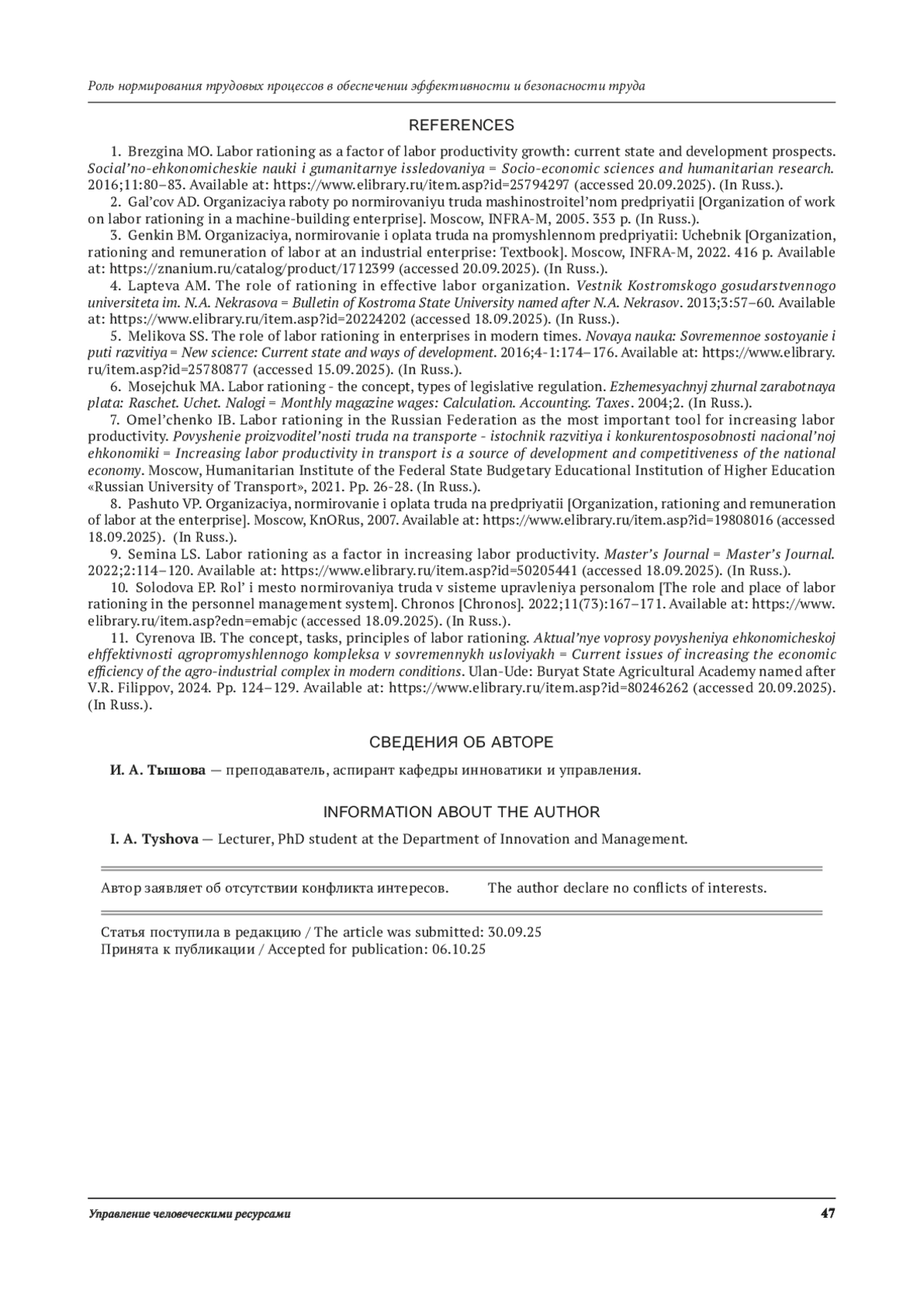 5. Меликова С. С. Роль нормирования труда на предприятиях в современное время // Новая наука: современное состояние и пути развития. 2016. № 4-1. С. 174-176. URL: item.asp?id=25780877 ( дата обращения 15.09.2025). EDN: VSEFXX