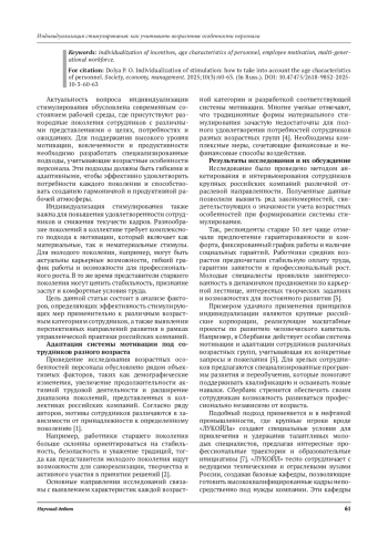 Рассматриваются теоретические основы индивидуализации стимулирования, выделяются наиболее важные показатели, оказывающие воздействие на процесс мотивации сотрудников различных возрастных групп. Представлены результаты эмпирического исследования, проведенного среди сотрудников российских организаций, демонстрирующего зависимость видов и форм стимулирования от возраста респондентов. Особое внимание уделено положительным результатам и основным вызовам, связанным с внедрением индивидуального подхода к стимулированию. Предложены практические рекомендации для руководителей и HR-менеджеров по совершенствованию существующей системы стимулирования с целью повышения производительности труда и улучшения морального климата в коллективе.