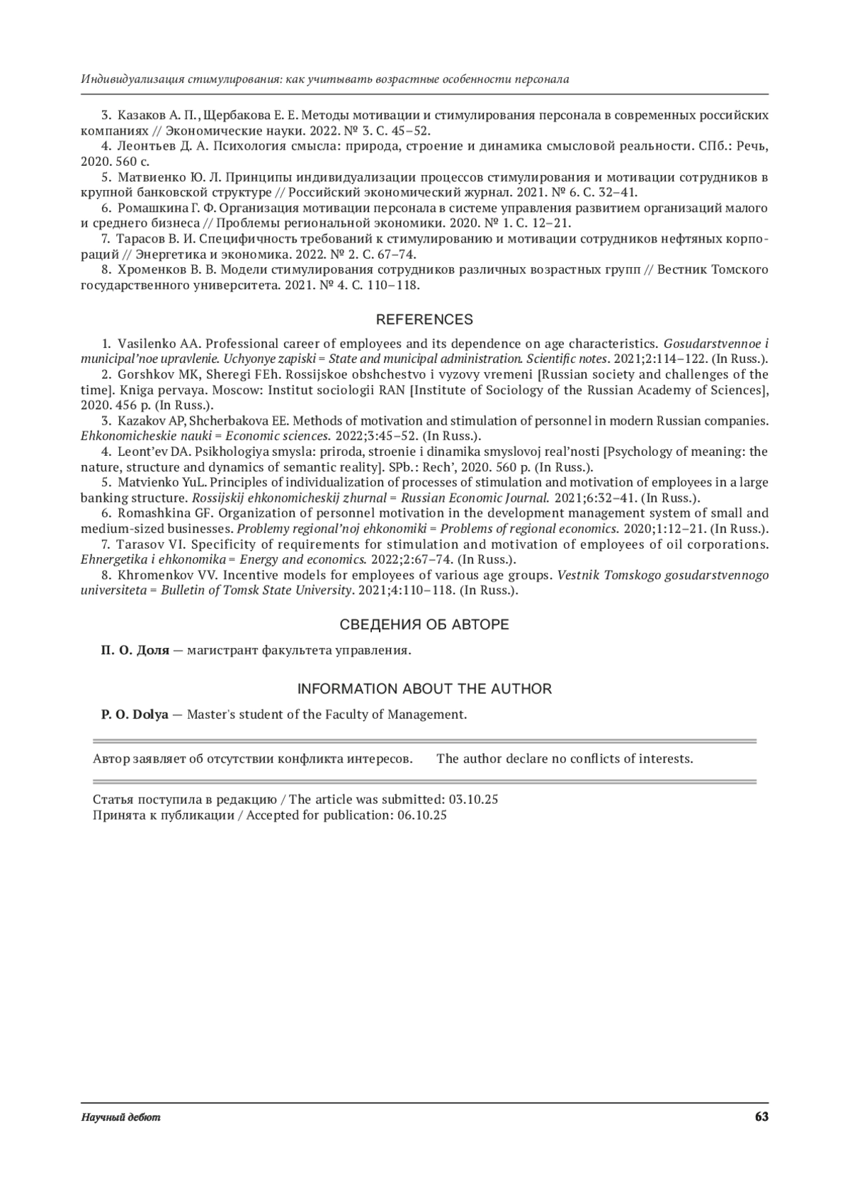 5. Матвиенко Ю. Л. Принципы индивидуализации процессов стимулирования и мотивации сотрудников в крупной банковской структуре // Российский экономический журнал. 2021. № 6. С. 32-41.