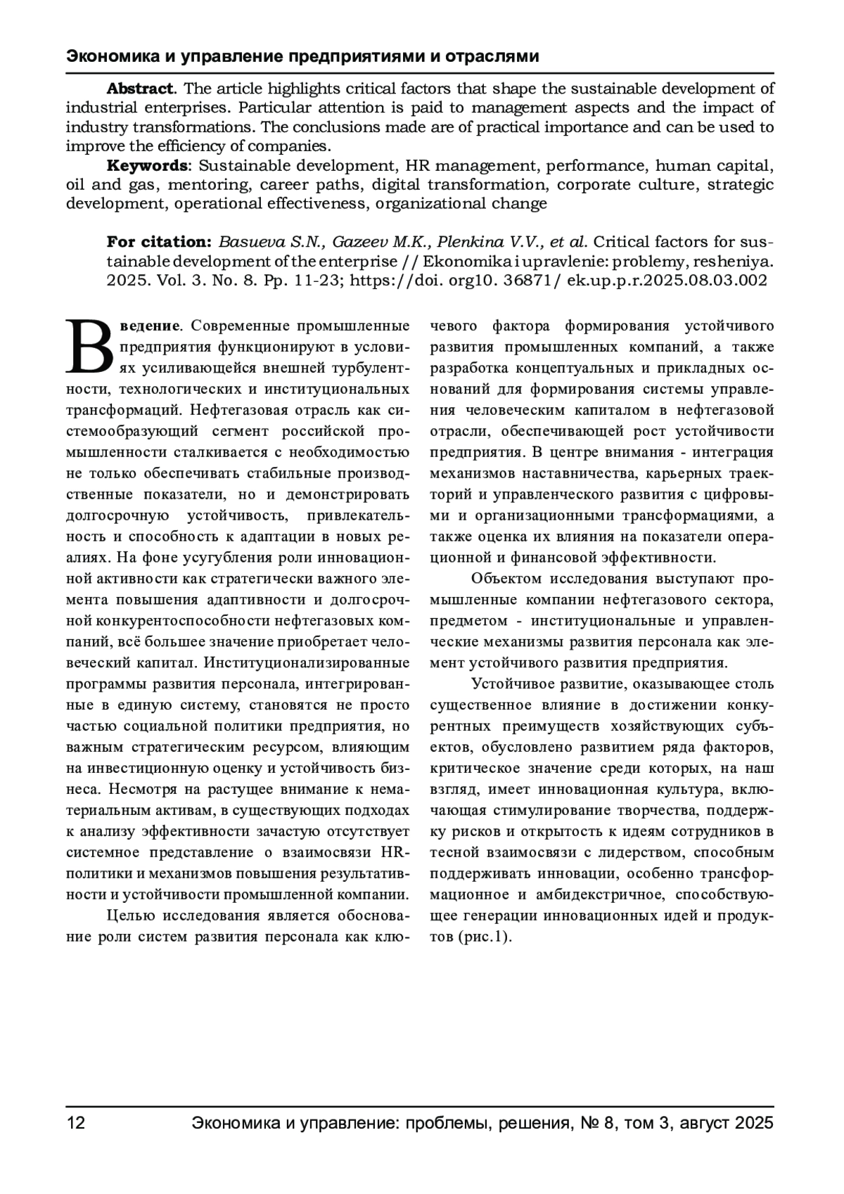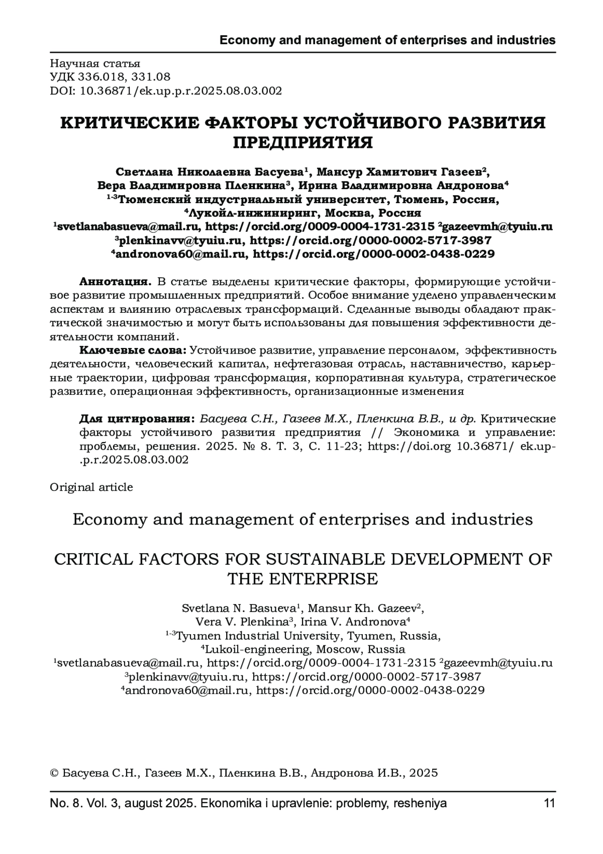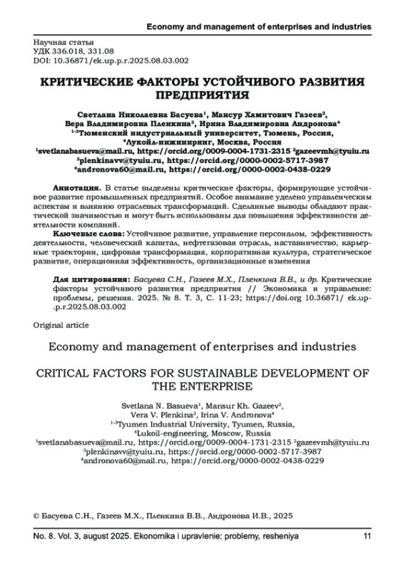 В статье выделены критические факторы, формирующие устойчивое развитие промышленных предприятий. Особое внимание уделено управленческим аспектам и влиянию отраслевых трансформаций. Сделанные выводы обладают практической значимостью и могут быть использованы для повышения эффективности деятельности компаний.