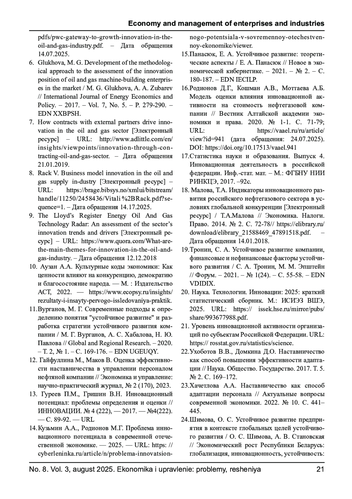 16. Родионов Д.Г., Кошман А.В., Моттаева А.Б. Модель оценки влияния инновационной активности на стоимость нефтегазовой компании // Вестник Алтайской академии экономики и права. 2020. № 1-1. С. 71-79; URL: https://vaael.ru/ru/article/view?id=941 (дата обращения: 24.07.2025). DOI: 10.17513/vaael.941 EDN: GRXBBD