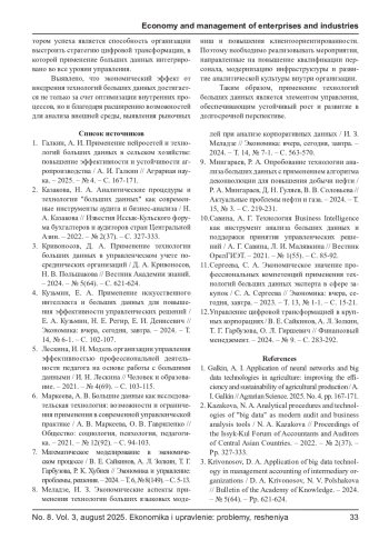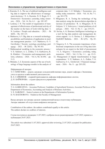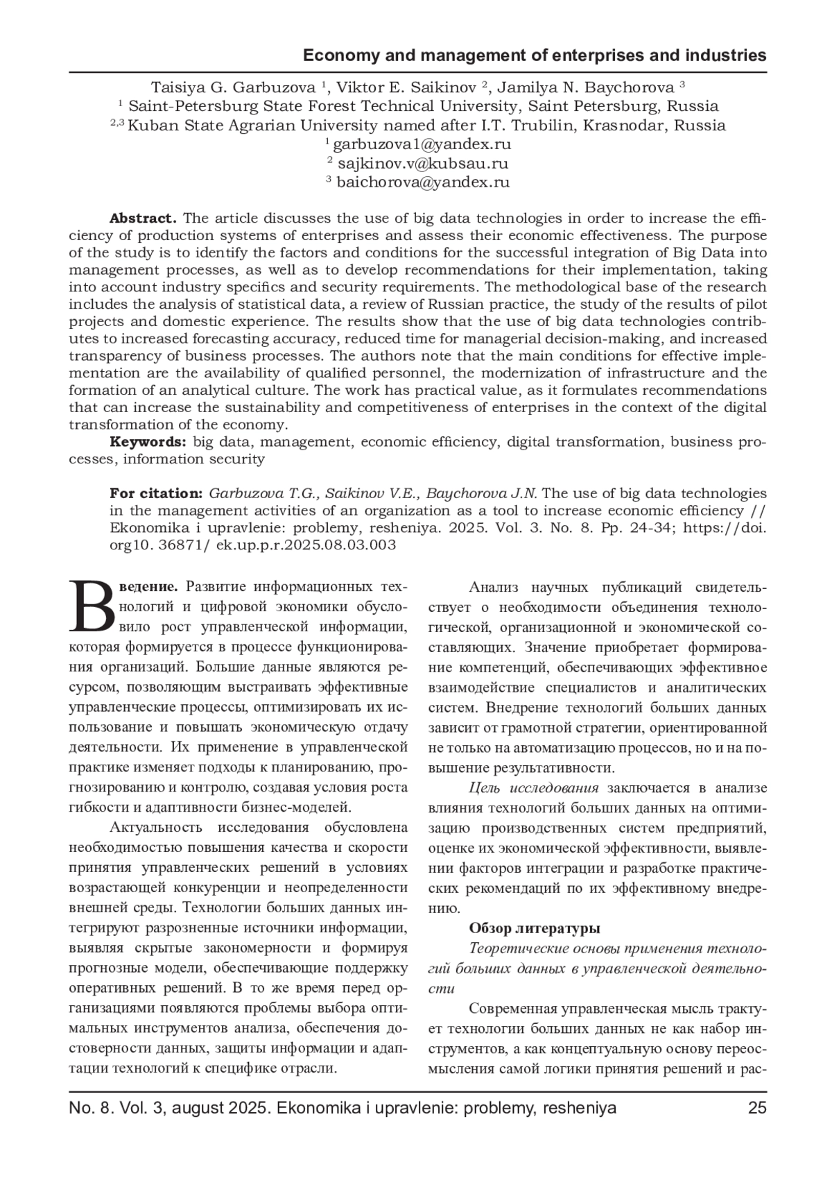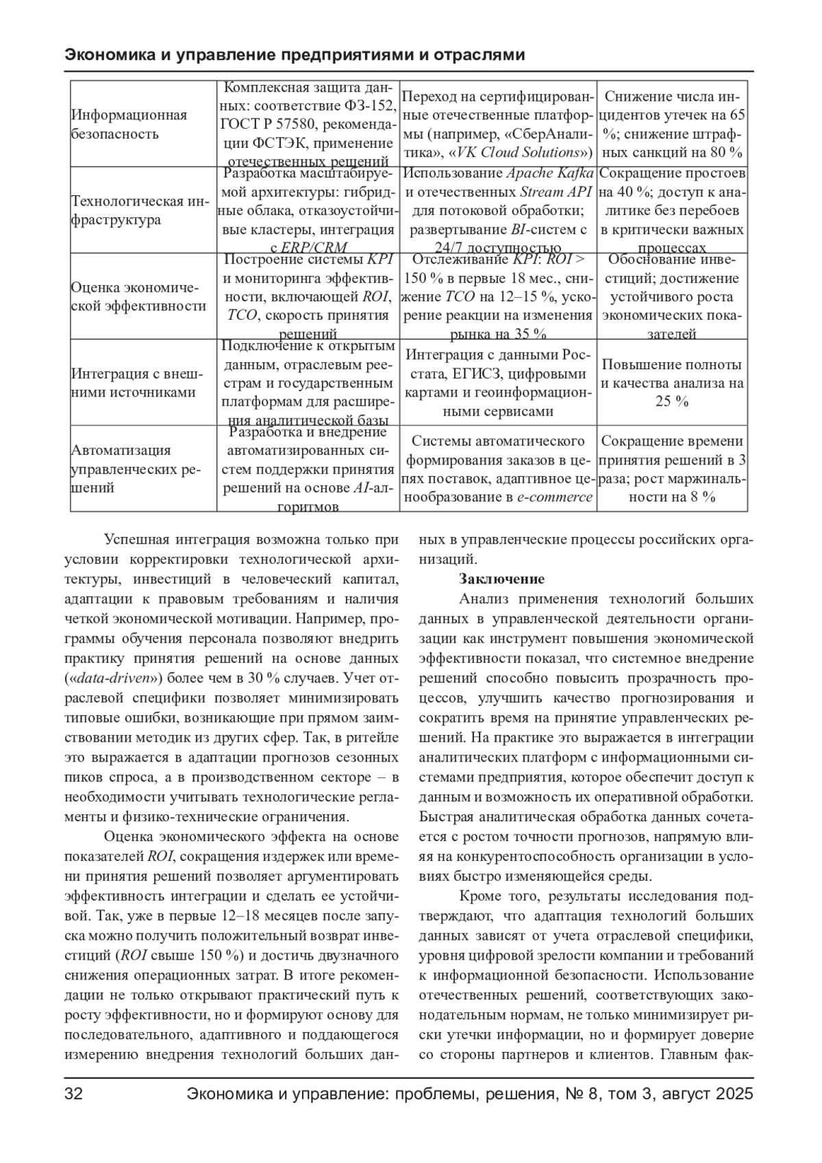 Цель исследования состоит в выявлении факторов и условий успешной интеграции Big Data в управленческие процессы, а также в разработке рекомендаций по их внедрению с учетом отраслевой специфики и требований безопасности. Методическая база исследования включает анализ статистических данных, обзор российской практики, изучение результатов пилотных проектов и отечественного опыта. Результаты показывают, что использование технологий больших данных способствует росту точности прогнозирования, сокращению времени на принятие управленческих решений и повышению прозрачности бизнес-процессов. Авторы отмечают, что главными условиями эффективного внедрения являются наличие квалифицированных кадров, модернизация инфраструктуры и формирование аналитической культуры. Работа имеет практическую ценность, т. к. формулирует рекомендации, способные повысить устойчивость и конкурентоспособность предприятий в условиях цифровой трансформации экономики.