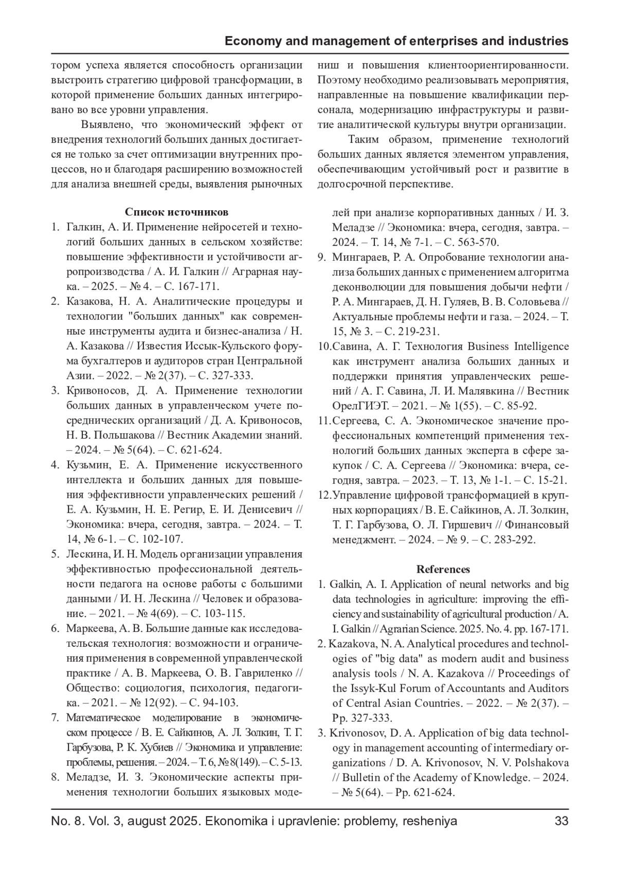 1. Галкин, А. И. Применение нейросетей и технологий больших данных в сельском хозяйстве: повышение эффективности и устойчивости агропроизводства / А. И. Галкин // Аграрная наука. - 2025. - № 4. - С. 167-171. EDN: SSSTEM