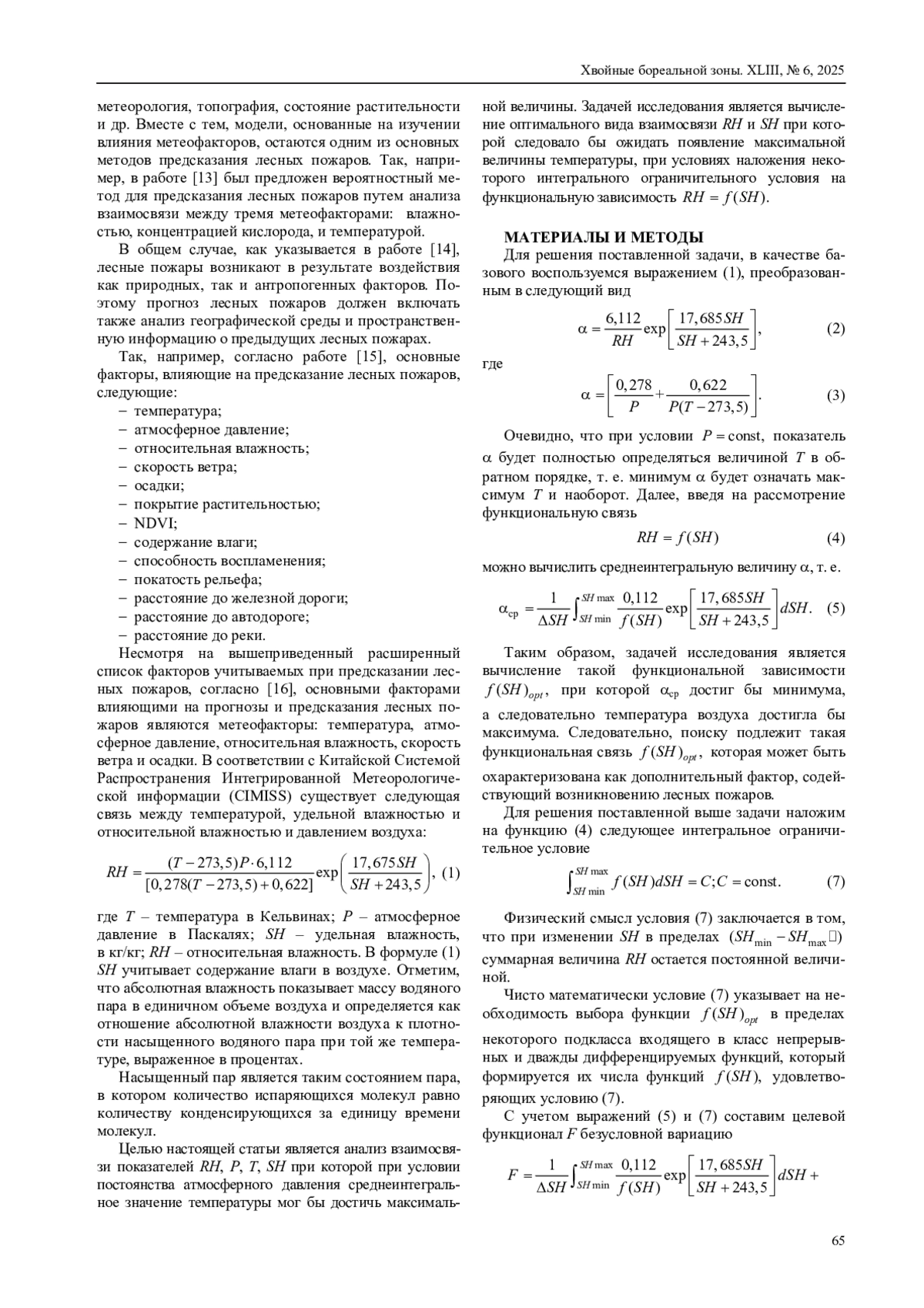 Статья посвящена исследованию проблемы влияния метеофакторов на вероятность возникновения лесных пожаров. Сформулирована частная задача исследования влияния взаимосвязи относительной влажности воздуха и удельной влажности, при которой появляется дополнительный фактор, содействующий возникновению лесных пожаров путем увеличения температуры воздуха. Составлена и решена вариационная оптимизационная задача, решение которой при некотором ограничительном условии позволяет вычислить оптимальную взаимосвязь относительной влажности и удельной влажности при которой температура воздуха достигает максимальной величины. Данный фактор может быть рассмотрен в качестве дополнительного фактора содействующего возникновению лесных пожаров.