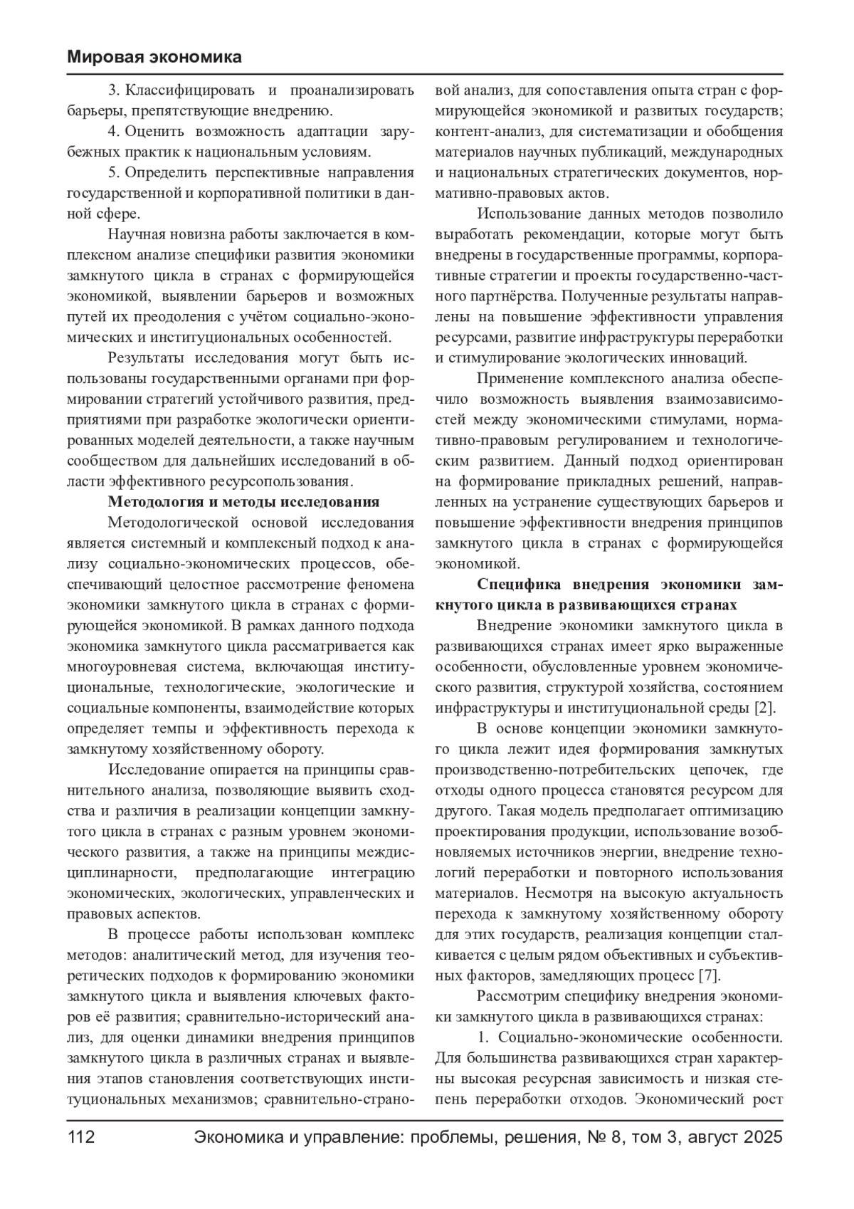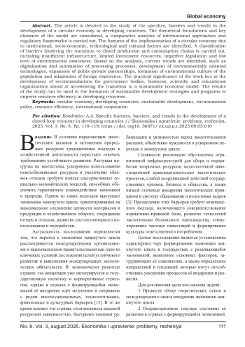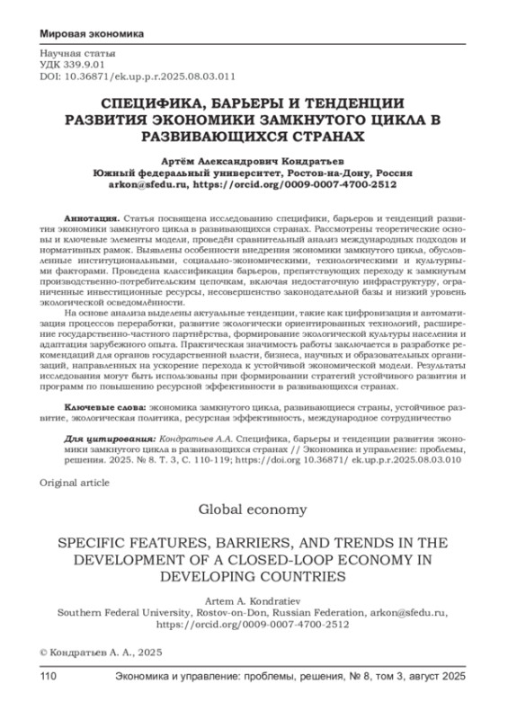 Статья посвящена исследованию специфики, барьеров и тенденций развития экономики замкнутого цикла в развивающихся странах. Рассмотрены теоретические основы и ключевые элементы модели, проведён сравнительный анализ международных подходов и нормативных рамок. Выявлены особенности внедрения экономики замкнутого цикла, обусловленные институциональными, социально-экономическими, технологическими и культурными факторами. Проведена классификация барьеров, препятствующих переходу к замкнутым производственно-потребительским цепочкам, включая недостаточную инфраструктуру, ограниченные инвестиционные ресурсы, несовершенство законодательной базы и низкий уровень экологической осведомлённости. На основе анализа выделены актуальные тенденции, такие как цифровизация и автоматизация процессов переработки, развитие экологически ориентированных технологий, расширение государственно-частного партнёрства, формирование экологической культуры населения и адаптация зарубежного опыта. Практическая значимость работы заключается в разработке рекомендаций для органов государственной власти, бизнеса, научных и образовательных организаций, направленных на ускорение перехода к устойчивой экономической модели. Результаты исследования могут быть использованы при формировании стратегий устойчивого развития и программ по повышению ресурсной эффективности в развивающихся странах.