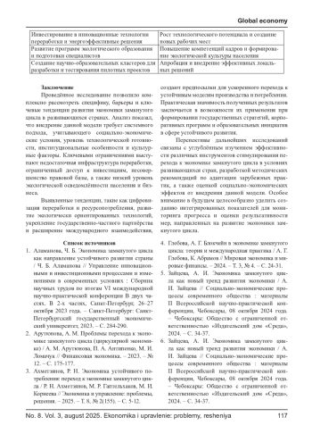 11. Особенности перехода к экономике замкнутого цикла / Т. М. Вахитова, Э. Р. Тимергазизова, Л. А. Гаделшина, З. Н. Заппарова // Финансовая экономика. - 2025. - № 1. - С. 119-121. EDN: YLMLWM