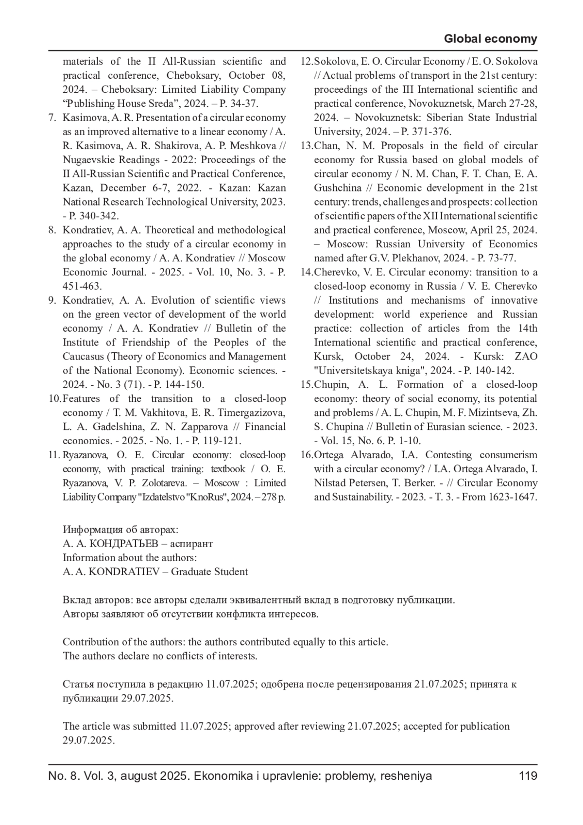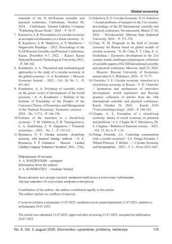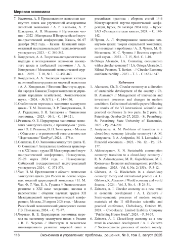 9. Кондратьев, А. А. Теоретико-методологические подходы к исследованию экономики замкнутого цикла в глобальной экономике / А. А. Кондратьев // Московский экономический журнал. - 2025. - Т. 10, № 3. - С. 451-463. EDN: ELSYTC