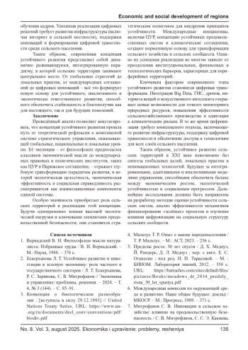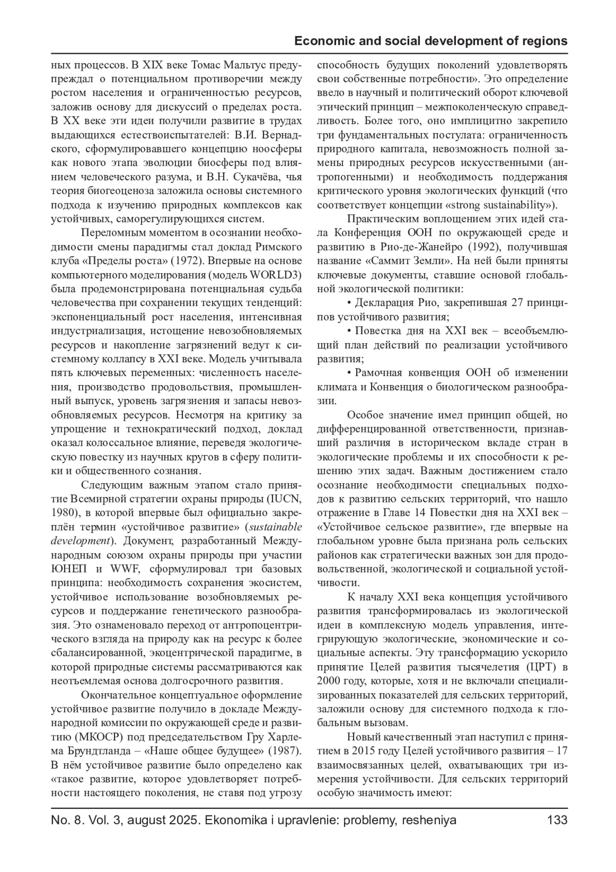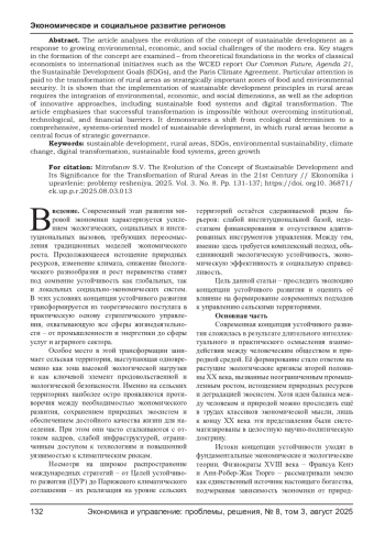 В статье анализируется эволюция концепции устойчивого развития как ответа на нарастающие экологические, экономические и социальные вызовы современности. Рассматриваются ключевые этапы формирования концепции - от теоретических предпосылок в трудах классиков экономической мысли до международных инициатив, таких как доклад МКОСР «Наше общее будущее», Повестка дня на XXI век, Цели устойчивого развития (ЦУР) и Парижское климатическое соглашение. Особое внимание уделено трансформации сельских территорий как стратегически важных зон продовольственной и экологической безопасности. Показано, что реализация принципов устойчивого развития на сельских территориях требует интеграции экологических, экономических и социальных аспектов, а также внедрения инновационных подходов, включая концепцию устойчивых продовольственных систем и цифровую трансформацию. Подчёркивается, что успешная трансформация невозможна без преодоления институциональных, технологических и финансовых барьеров. Статья демонстрирует переход от экологического детерминизма к комплексной, системно-ориентированной модели устойчивого развития, в которой сельские территории становятся центральным объектом стратегического управления.