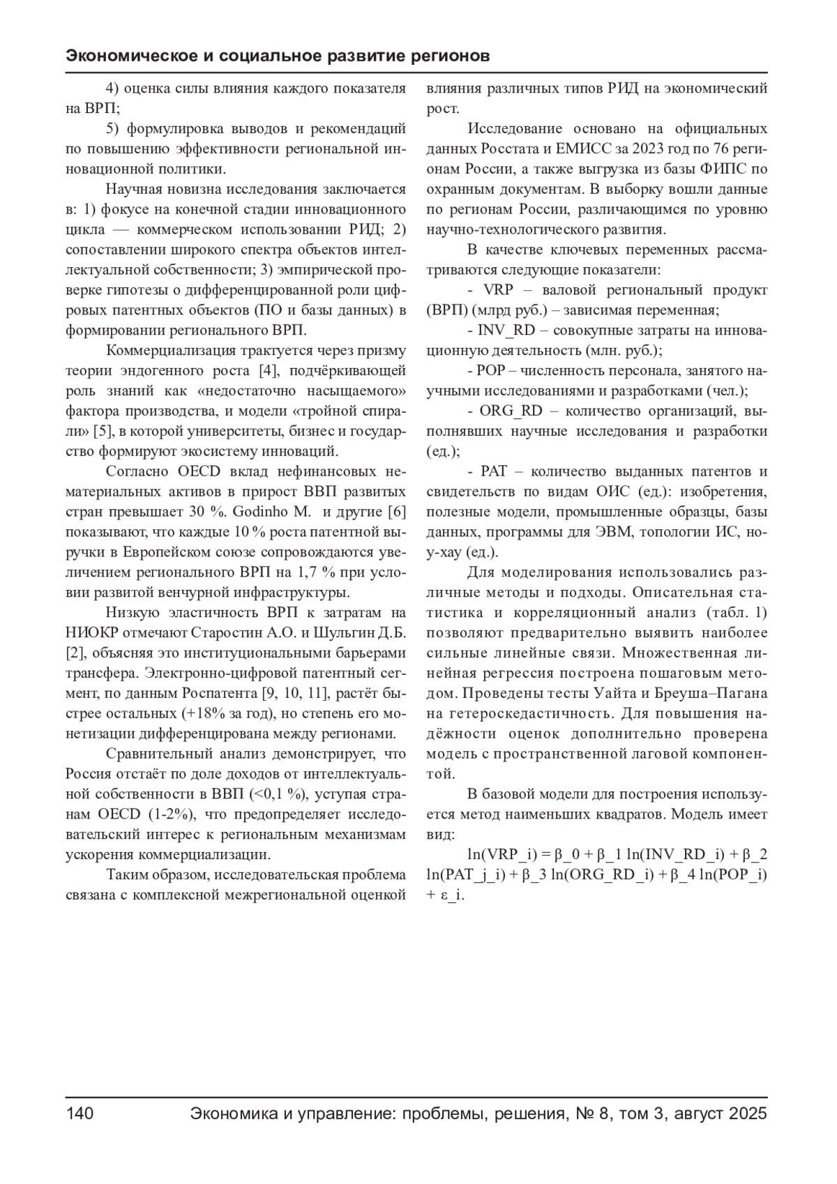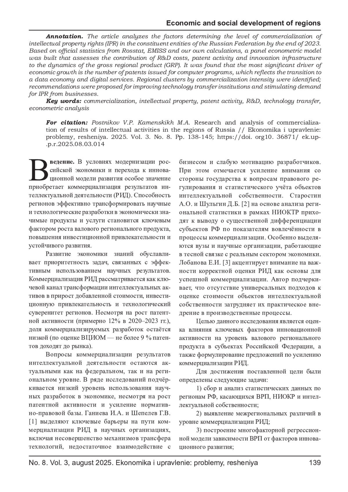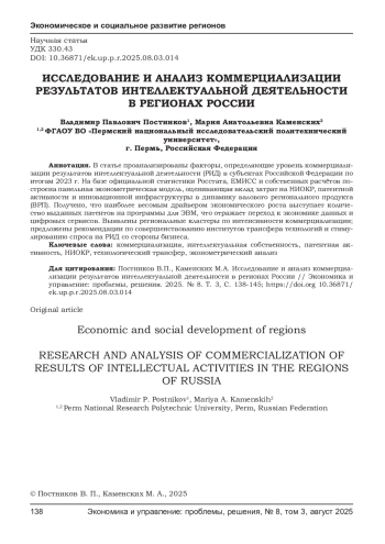 В статье проанализированы факторы, определяющие уровень коммерциализации результатов интеллектуальной деятельности (РИД) в субъектах Российской Федерации по итогам 2023 г. На базе официальной статистики Росстата, ЕМИСС и собственных расчётов построена панельная эконометрическая модель, оценивающая вклад затрат на НИОКР, патентной активности и инновационной инфраструктуры в динамику валового регионального продукта (ВРП). Получено, что наиболее весомым драйвером экономического роста выступает количество выданных патентов на программы для ЭВМ, что отражает переход к экономике данных и цифровых сервисов. Выявлены региональные кластеры по интенсивности коммерциализации; предложены рекомендации по совершенствованию институтов трансфера технологий и стимулированию спроса на РИД со стороны бизнеса.