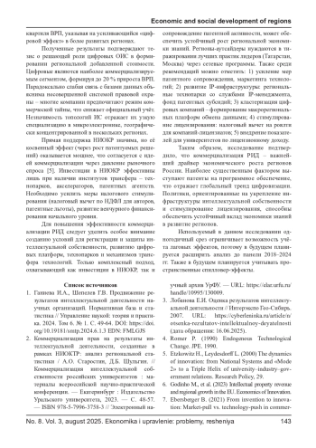9. Ульяшина С.Ю., Александрова А.В., Молодкин А.В., Бабикова О.И. Аналитические исследования сферы интеллектуальной собственности 2023: использование результатов интеллектуальной деятельности в регионах Российской Федерации - М.: Федеральный институт промышленной собственности (ФИПС), 2024, 62 с. EDN: VKSMNC