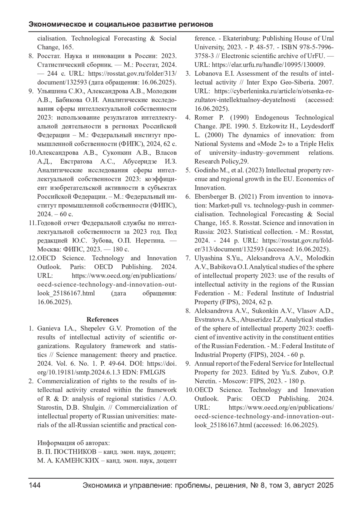 1. Ганиева И.А., Шепелев Г.В. Продвижение результатов интеллектуальной деятельности научных организаций. Нормативная база и статистика // Управление наукой: теория и практика. 2024. Том 6. № 1. С. 49-64. DOI: 10.19181/smtp.2024.6.1.3 EDN: FMLGJS