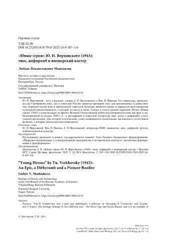 Ю. Н. Верховский – поэт и филолог, ученик А. Н. Веселовского и Вяч. И. Иванова. Его творчество, принадлежа как Серебряному веку, так и советской России, является примером того, как преломлялись художественные открытия начала века в официальной советской культуре, является одним из вариантов восстановления культурной преемственности, о которой он писал в своих статьях и стихах разных периодов. Поэма «Юные герои» (1943) о комсомольцах на фронте Великой Отечественной войны рассматривается нами как факт и мобилизационной культуры 1940-х гг., и реставрации в советской литературе черт эпоса и дифирамба, сознательной архаизации, при которой поэтическому слову возвращаются изначальные магическая и суггестивная функции, о которых писали русские символисты.