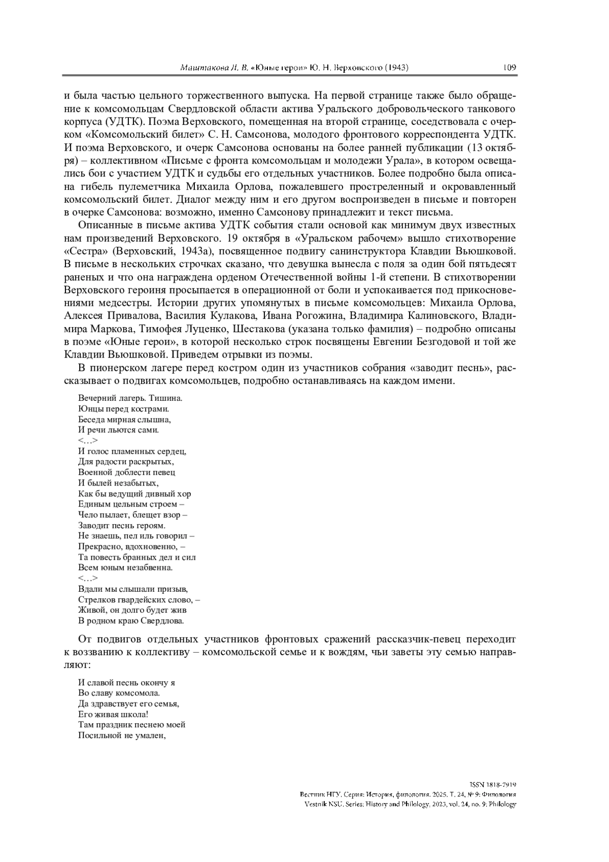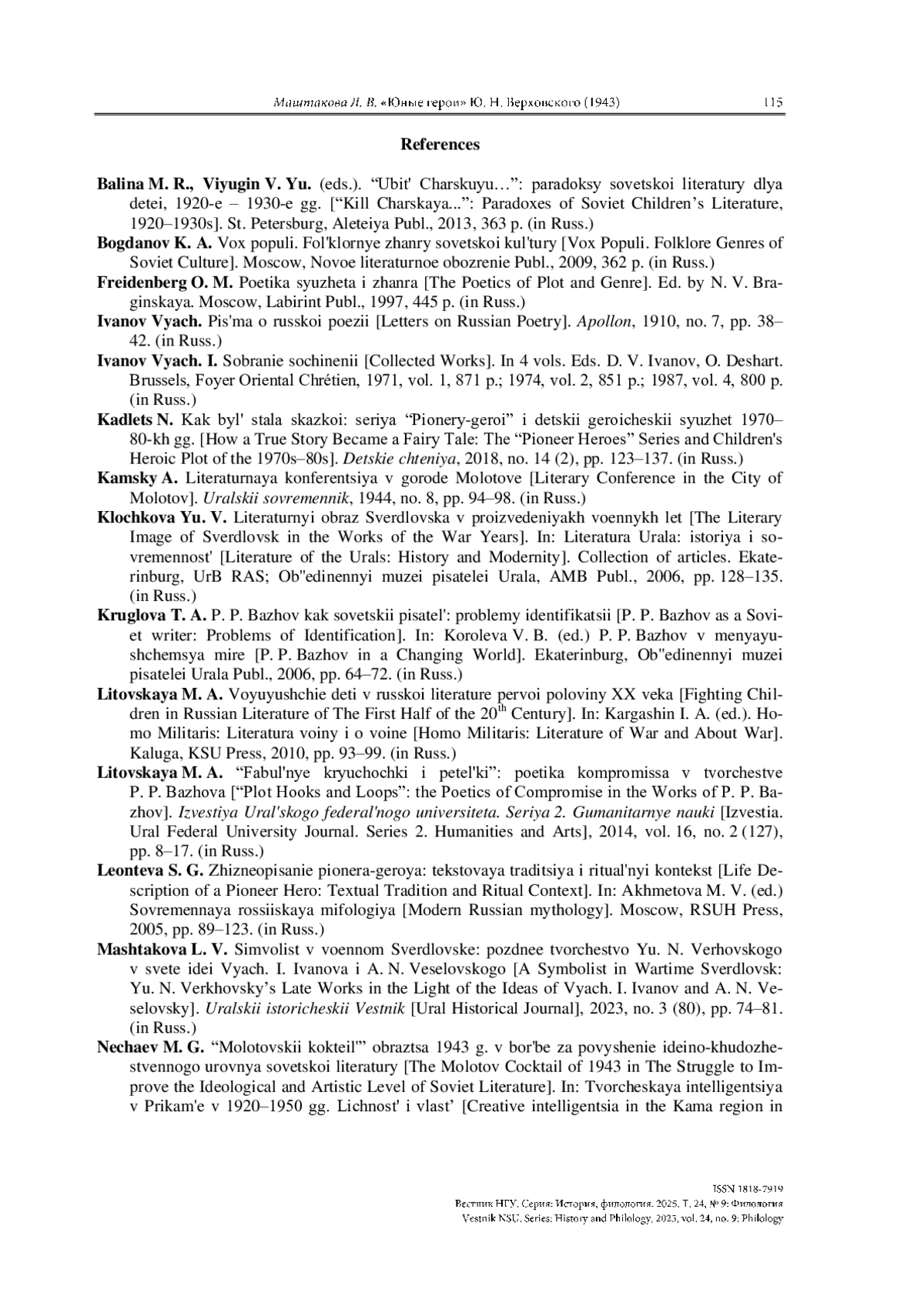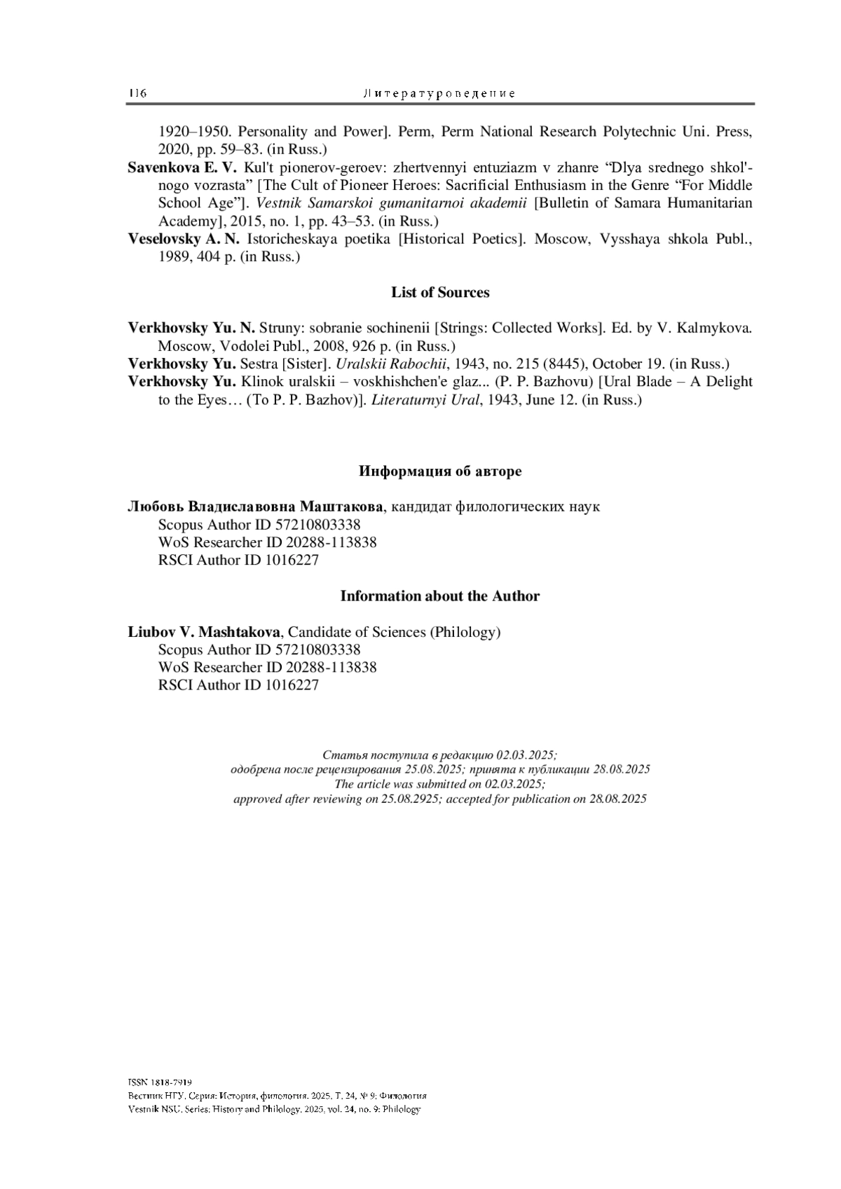 12. Маштакова Л. В. Символист в военном Свердловске: позднее творчество Ю. Н. Верховского в свете идей Вяч. И. Иванова и А. Н. Веселовского // Уральский исторический вестник. 2023. № 3 (80). С. 74−81.