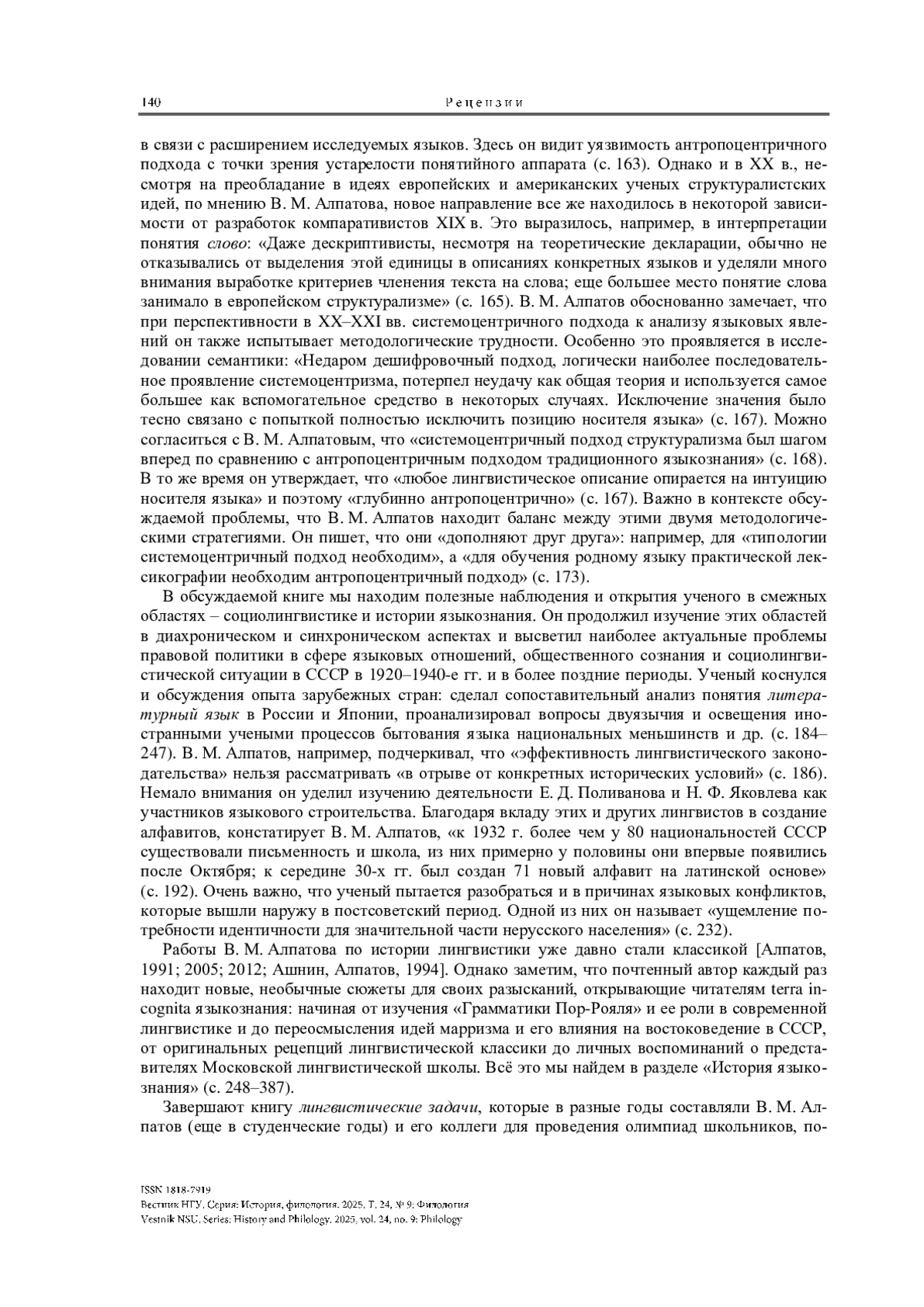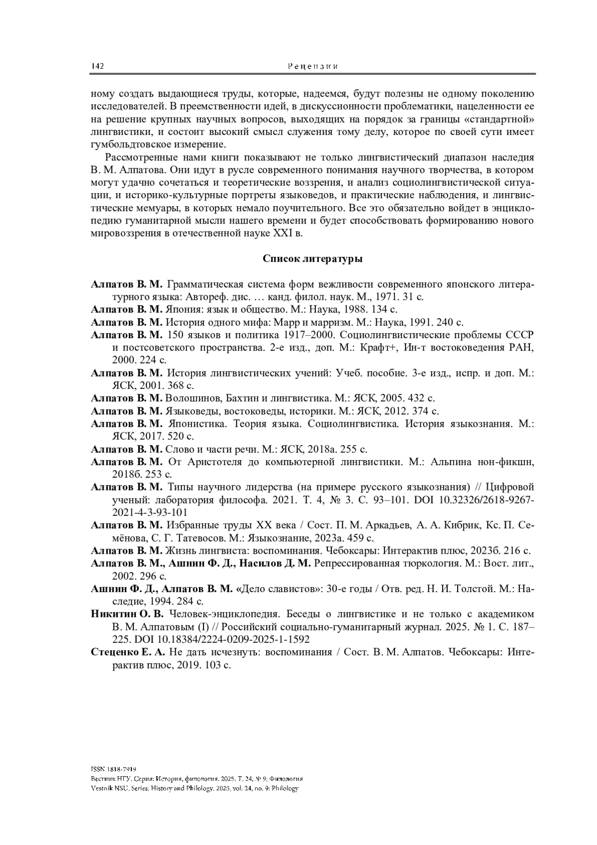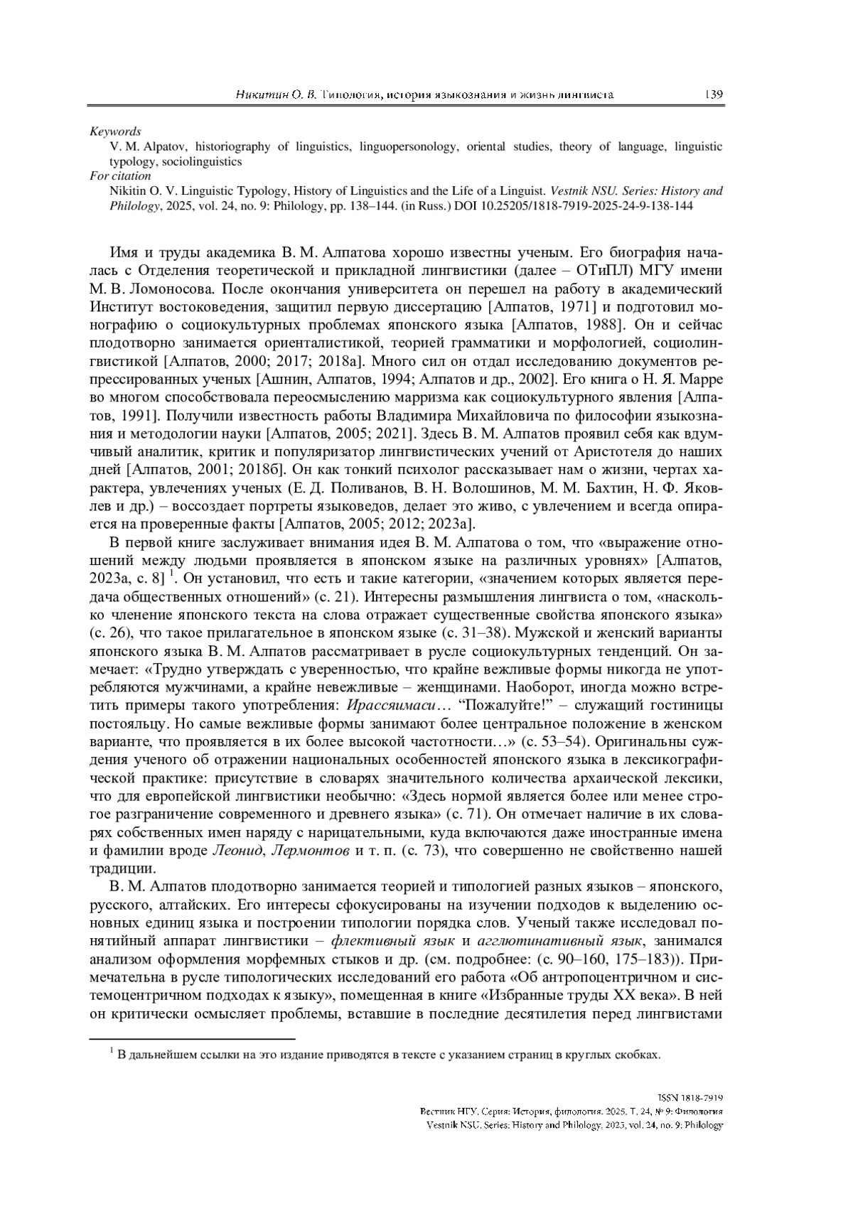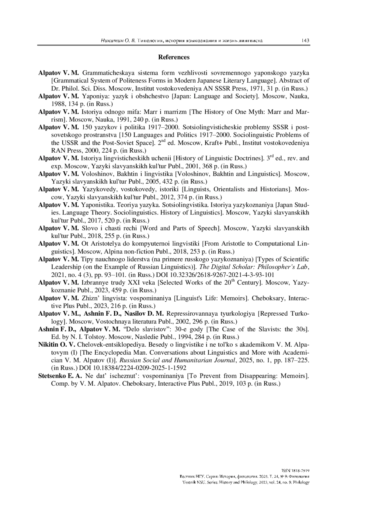 16. Никитин О. В. Человек-энциклопедия. Беседы о лингвистике и не только с академиком В. М. Алпатовым (I) // Российский социально-гуманитарный журнал. 2025. № 1. С. 187-225. https://doi.org/10.18384/2224-0209-2025-1-1592