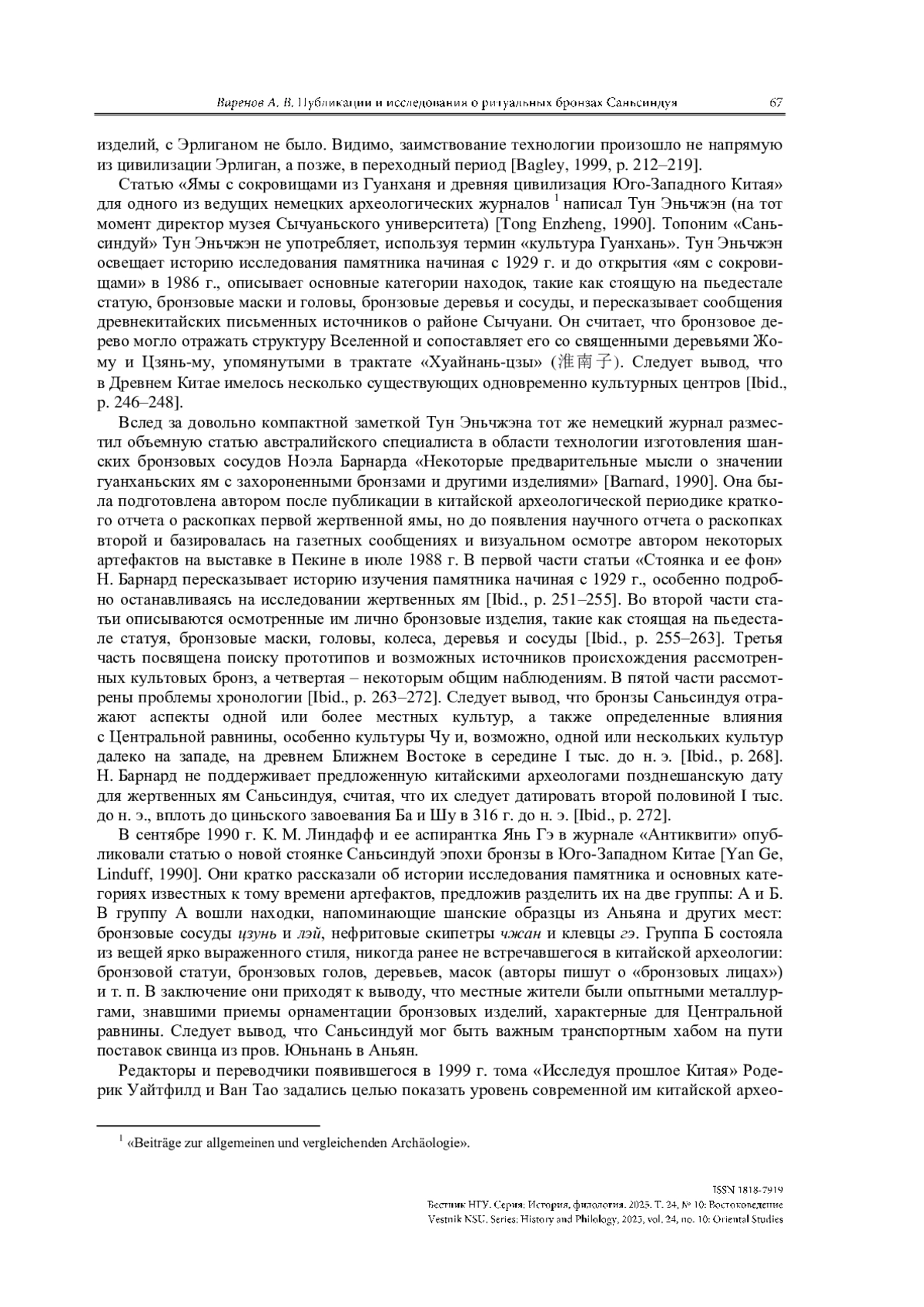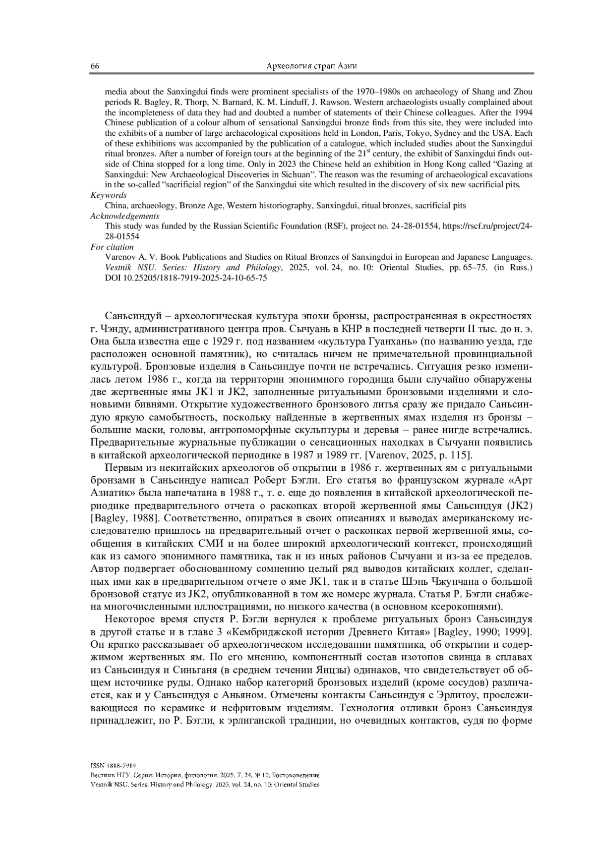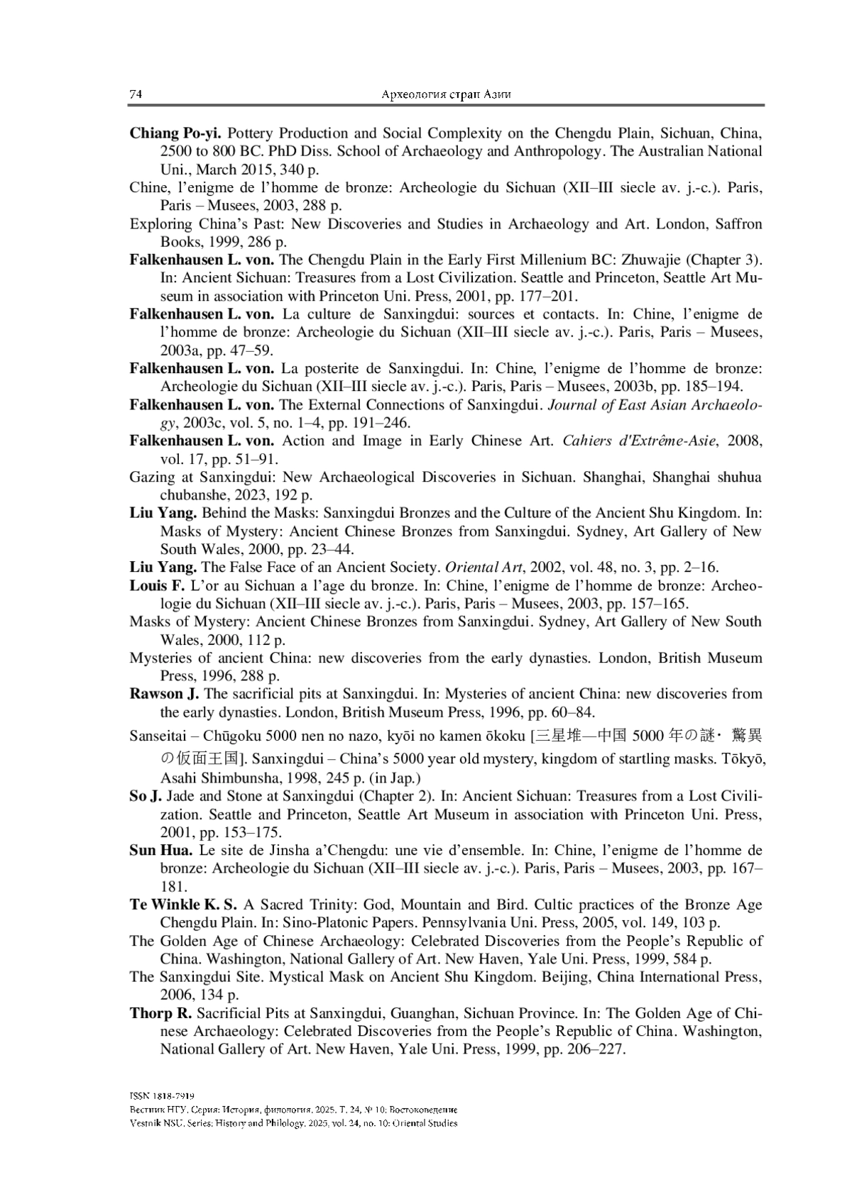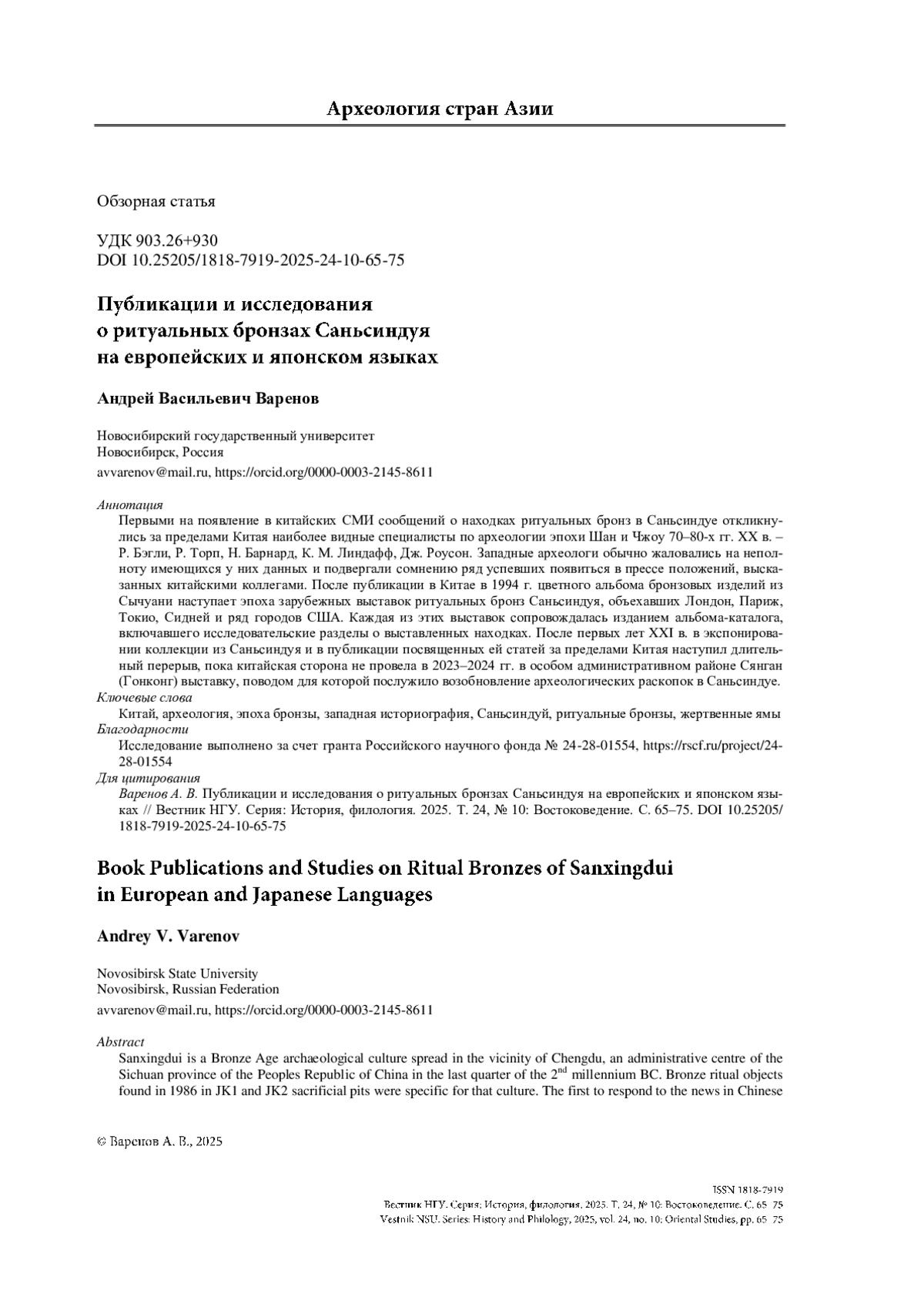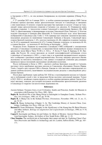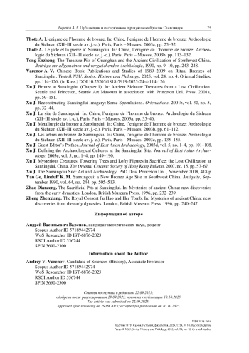 33. Varenov A. V. Chinese Book Publications and Studies of 1989-2009 on Ritual Bronzes of Sanxingdui. Vestnik NSU. Series: History and Philology, 2025, vol. 24, no. 4: Oriental Studies, pp. 114-126. (in Russ.) https://doi.org/10.25205/1818-7919-2025-24-4-114-126