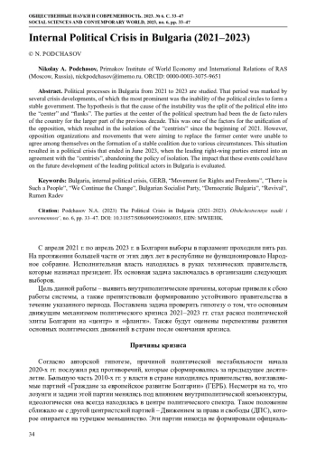 Рассмотрены внутриполитические процессы в Болгарии в период с 2021 по 2023 г. Цель исследования – выявить причины кризисных явлений в стране, из которых наиболее ярким стала неспособность политических кругов создать устойчивое правительство. Выдвинута гипотеза, согласно которой причиной нестабильности послужил раскол политической элиты на «центр» и «фланги». Партии в центре политического спектра фактически управляли страной на протяжении предыдущего десятилетия. В том числе из-за этой тенденции оппозиция объединилась в единый блок, в результате чего с начала 2021 г. центристы оказались в изоляции. Тем не менее, организации и движения, которые планировали заместить собой прежний центр, в силу различных обстоятельств не смогли договориться о формировании стабильной коалиции. Возник политический кризис, который завершился в июне 2023 г. после того, как ведущие правые партии заключили соглашение с центристами, отказавшись от курса на их изоляцию. На основании выдвинутых предположений оценено, насколько рассматриваемые события повлияли на перспективы развития ведущих политических сил Болгарии