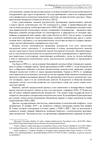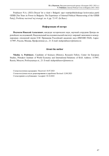 6. Подчасов Н.А. (2021) Десять лет у власти в Болгарии: опыт внутриполитического лавирования партии ГЕРБ // Проблемы национальной стратегии. № 4. С. 72-97. EDN: OPSUPJ
