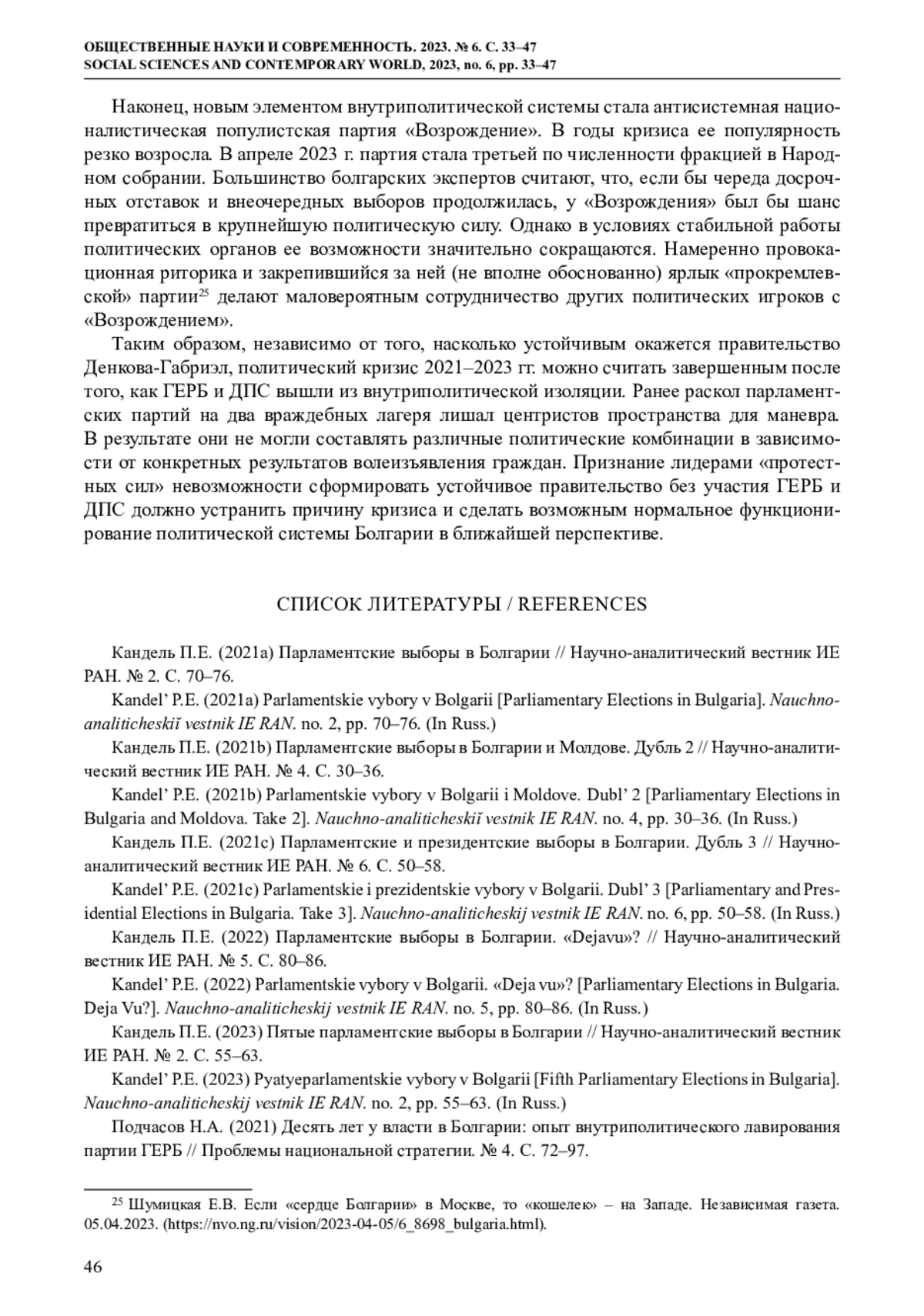 3. Кандель П.Е. (2021c) Парламентские и президентские выборы в Болгарии. Дубль 3 // Научно-аналитический вестник ИЕ РАН. № 6. С. 50-58. EDN: GCSSDD