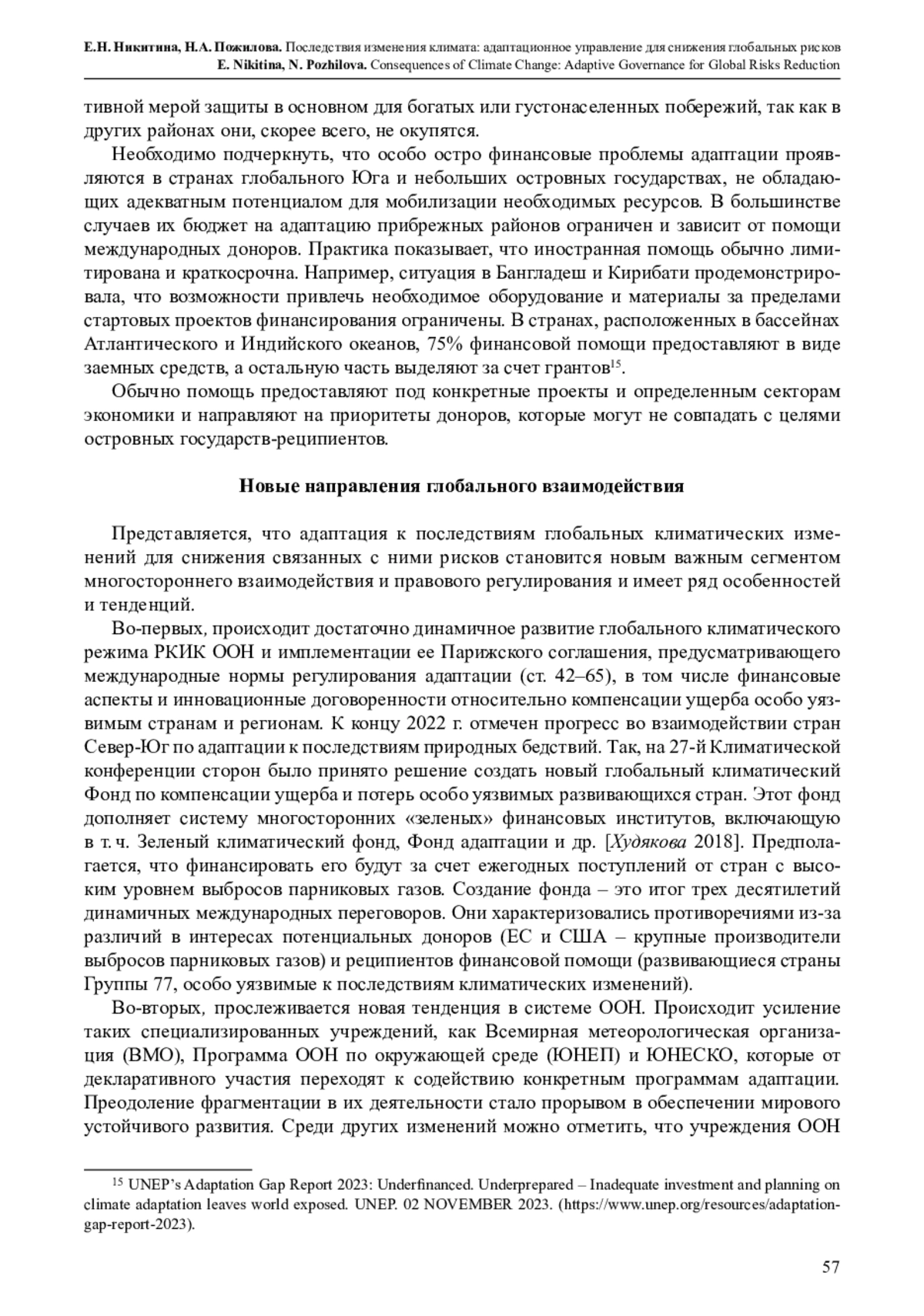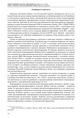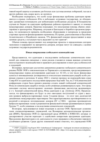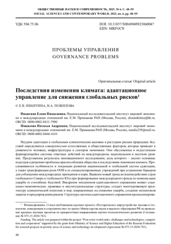 Неудачи адаптации к глобальным климатическим вызовам и растущим рискам природных бедствий определяются совокупностью естественных и общественных факторов, которые приводят к уязвимости человека, инфраструктуры и секторов экономики. Они обусловлены и недостатками формирующейся системы ответных действий на международном, национальном и местном уровнях. Представлены результаты инновационного исследования, цель которого – анализ основных подходов к решению проблемы приспособления общества к последствиям изменения климата. Прослеживаются особенности и тенденции развития национальной и глобальной систем адаптации, а также трансформация роли ООН и ее специализированных учреждений при устранении барьеров для соблюдения международных принципов и норм. Выявлен новый тренд во взаимодействии стран глобального Севера и глобального Юга при формировании международного фонда по компенсации ущерба от стихийных бедствий. Внедрение механизмов адаптационного управления меняет социально-экономические, правовые и институциональные структуры, создает многоуровневую архитектуру климатической политики и мер, направленных на снижение ущерба, создание механизмов защиты и предупреждения рисков. Структура системы адаптационного управления проанализирована с учетом климатических факторов и ответов на них. Прослежена взаимосвязь между глобальным потеплением, таянием ледников, удвоением темпов повышения уровня Мирового океана, угрозами для прибрежных и островных государств и мерами адаптации для снижения рисков от природных бедствий; проведена атрибуция факторов основных тенденций ответных действий