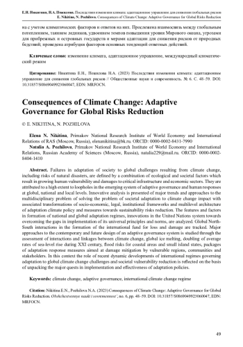 2. Никитина Е.Н. (2019) Изменение климата в Арктике: адаптация в ответ на новые вызовы // Контуры глобальных трансформаций: политика, экономика, право. Т. 12. № 5. С. 177-200. EDN: OISKHG