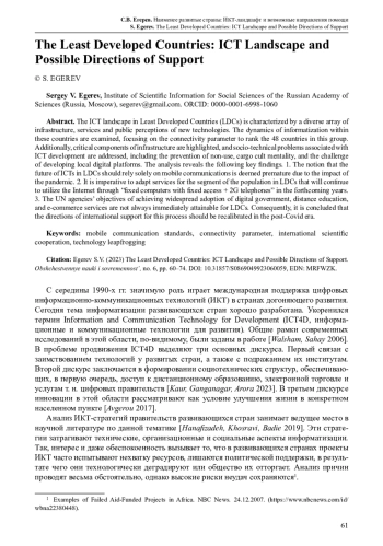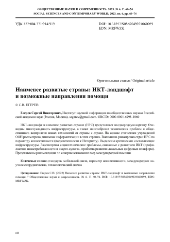 ИКТ-ландшафт в наименее развитых странах (НРС) представляет неоднородную картину. Очевидны многоукладность инфраструктуры, а также многообразие технических проблем и общественного восприятия новых технологий от страны к стране. На основе статистики учреждений ООН рассмотрена динамика информатизации в этих странах. Выполнена ранжировка стран НРС по параметру коннективности (подключенности к Интернету). Выделены критические составляющие инфраструктуры. Рассмотрены социотехнические проблемы, связанные с развитием ИКТ (профилактика невостребованности и «карго-культа», проблема развития локальных цифровых платформ). Представлены рекомендации по совершенствованию мер международной помощи