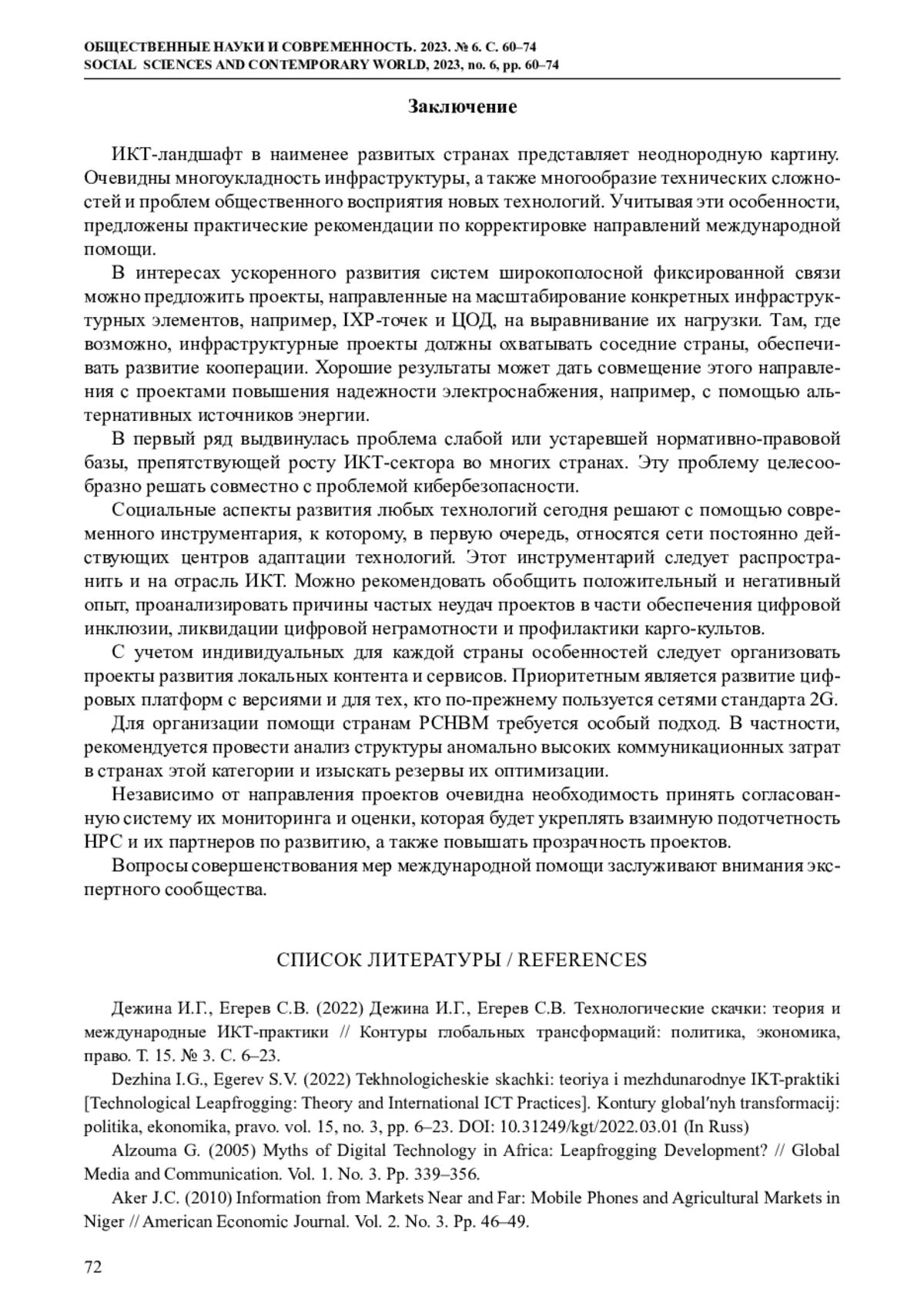 1. Дежина И.Г., Егерев С.В. (2022) Дежина И.Г., Егерев С.В. Технологические скачки: теория и международные ИКТ-практики // Контуры глобальных трансформаций: политика, экономика, право. Т. 15. № 3. С. 6-23. EDN: FXCQIT
