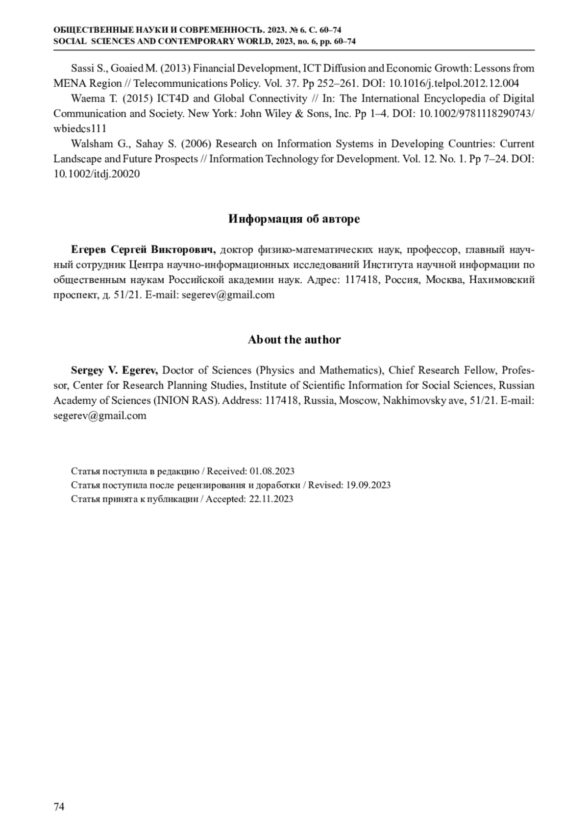 20. Masiero S. (2022) Should We Still be Doing ICT4D Research? // The Electronic Journal of Information Systems in Developing Countries. Vol. 88. No. 5. e12215. DOI: 10.1002/isd2.12215 EDN: WLQOIS