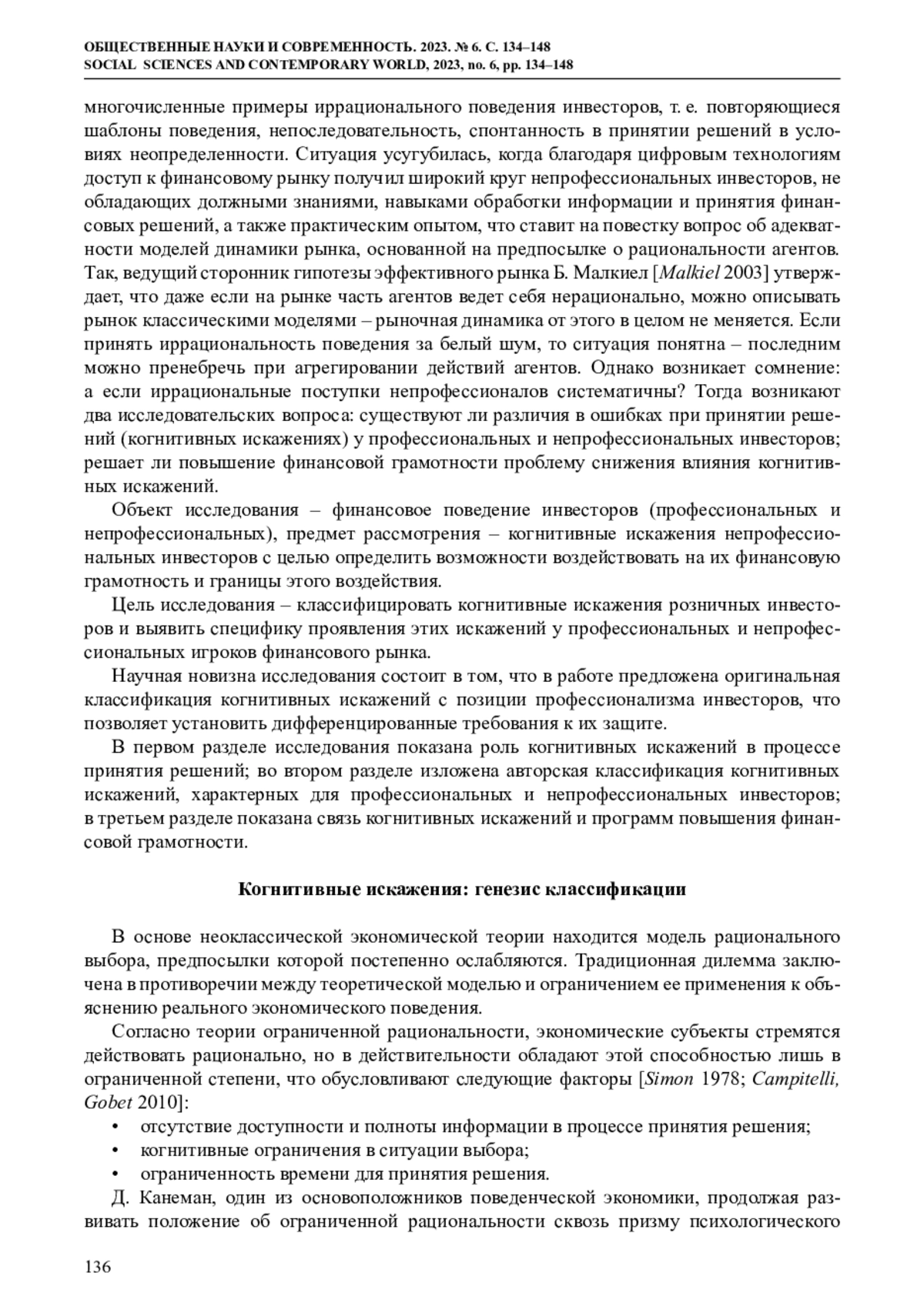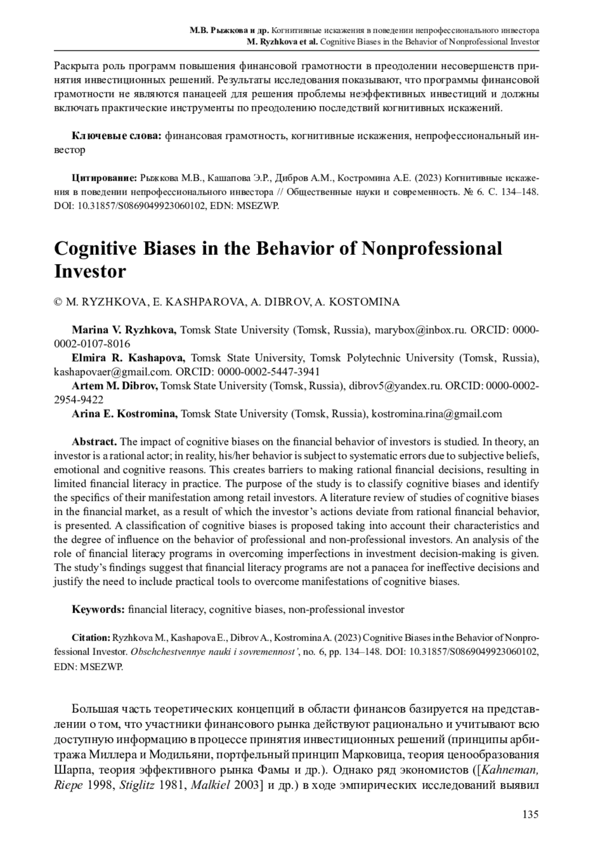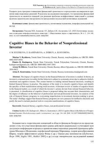Исследование посвящено влиянию когнитивных искажений на финансовое поведение инвесторов. В теории инвестор – рациональный актор, в реальности его поведение подвержено систематическим ошибкам вследствие субъективных убеждений, эмоциональных и когнитивных причин. Это создает барьеры для принятия им рациональных финансовых решений, в результате чего на практике проявляется ограниченная финансовая грамотность. Цель исследования – предложить классификацию когнитивных искажений и выявить специфику их влияния на поведение розничных инвесторов. Проведен обзор исследований когнитивных искажений на финансовом рынке, вследствие которых происходит отклонение действий инвестора от рационального финансового поведения. Отмечено, что разные группы когнитивных искажений могут проявляться у разных типов инвесторов Раскрыта роль программ повышения финансовой грамотности в преодолении несовершенств принятия инвестиционных решений. Результаты исследования показывают, что программы финансовой грамотности не являются панацеей для решения проблемы неэффективных инвестиций и должны включать практические инструменты по преодолению последствий когнитивных искажений.