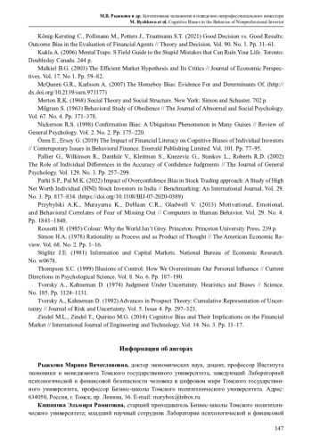 42. Zindel M.L., Zindel T., Quirino M.G. (2014) Cognitive Bias and Their Implications on the Financial Market // International Journal of Engineering and Technology. Vol. 14. No. 3. Pp. 11-17.