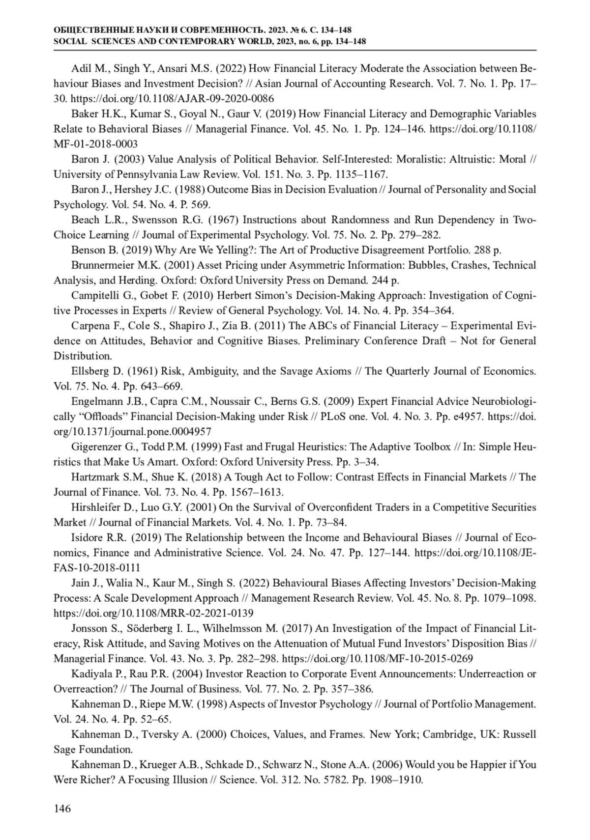 4. Adil M., Singh Y., Ansari M.S. (2022) How Financial Literacy Moderate the Association between Behaviour Biases and Investment Decision? // Asian Journal of Accounting Research. Vol. 7. No. 1. Pp. 17-30. DOI: 10.1108/AJAR-09-2020-0086 EDN: TGGVAX
