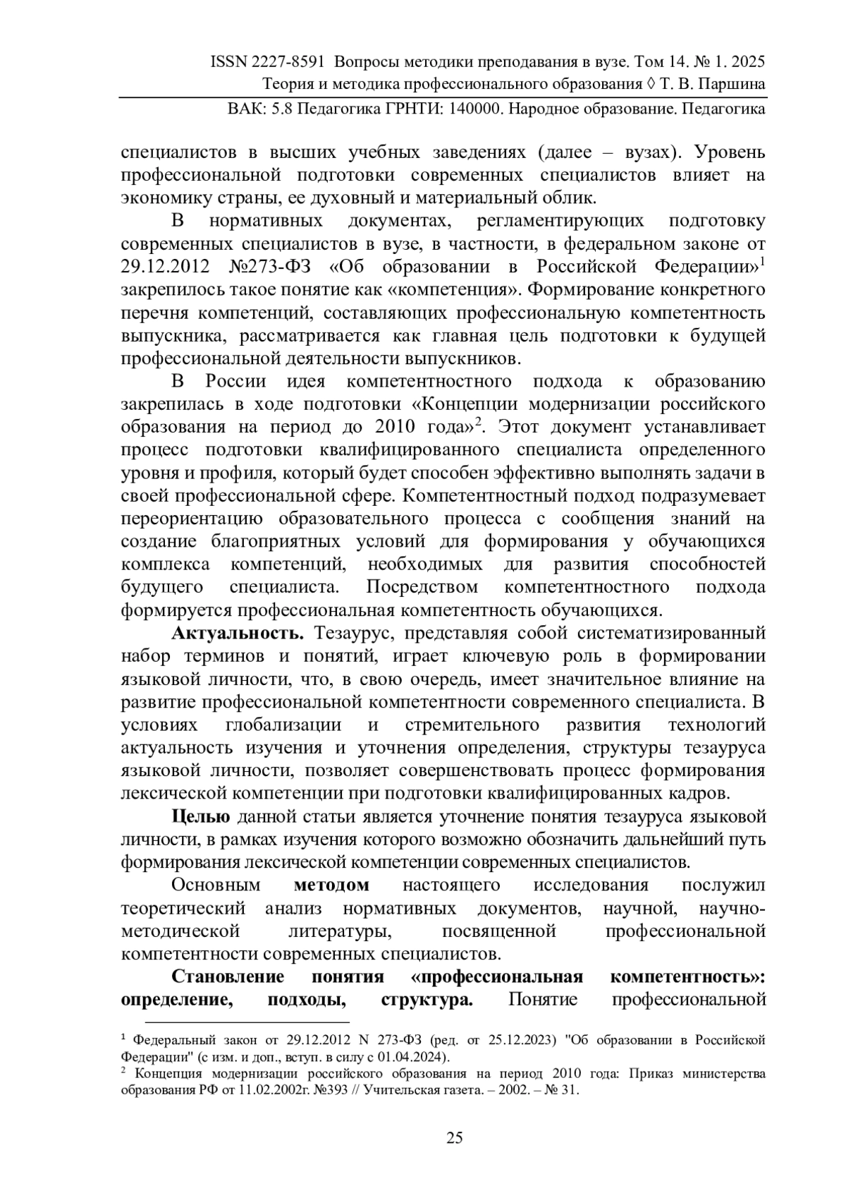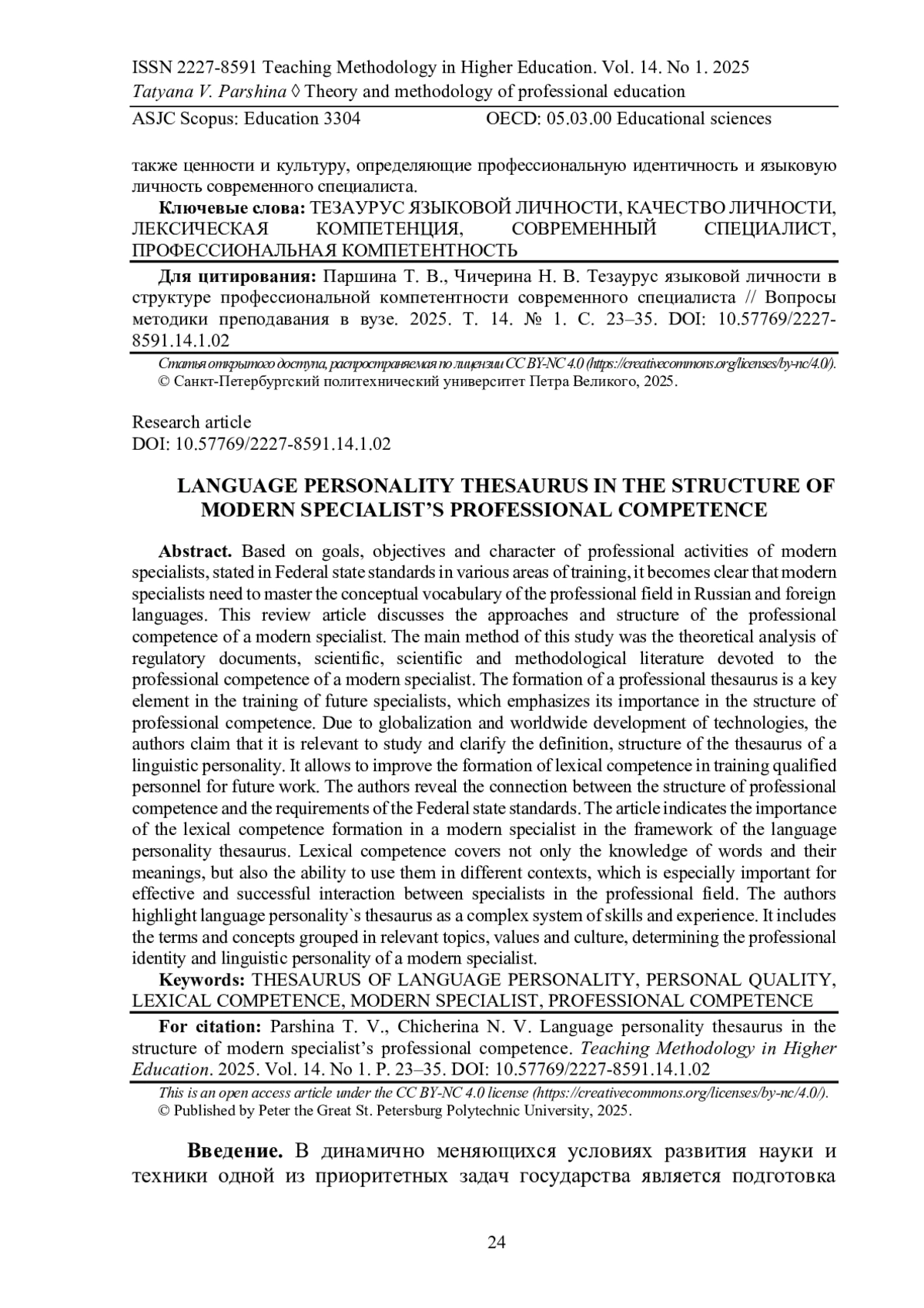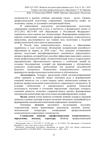 Исходя из целей, задач, характера профессиональной деятельности современных специалистов, закрепленных в Федеральных государственных стандартах по различным направлениям подготовки, становится ясной необходимость овладения современными специалистами понятийным аппаратом профессиональной области на русском и иностранном языках. В данной обзорной статье рассмотрены подходы к изучению и структура профессиональной компетентности современного специалиста. Основным методом настоящего исследования послужил теоретический анализ нормативных документов, научной, научно-методической литературы, посвященной профессиональной компетентности современного специалиста. Формирование профессионального тезауруса является ключевым элементом подготовки будущих специалистов, что подчеркивает его важность в структуре профессиональной компетентности. В условиях глобализации и стремительного развития технологий актуальность изучения и уточнения определения, структуры тезауруса языковой личности позволяет совершенствовать процесс формирования лексической компетенции при подготовке квалифицированных кадров к будущей трудовой деятельности. Выявлена связь структуры профессиональной компетентности с требованиями Федеральных государственных стандартов. Обозначена важность формирования лексической компетенции современного специалиста в рамках изучения тезауруса языковой личности. Лексическая компетенция охватывает не только знание слов и их значений, но и умение использовать их в различных контекстах, что особенно важно для эффективного и успешного взаимодействия между специалистами в профессиональной сфере. Уточнено понятие тезауруса языковой личности как сложной системы умений и опыта, включающей в себя не только термины и понятия, сгруппированные по соответствующим тематикам, но также ценности и культуру, определяющие профессиональную идентичность и языковую личность современного специалиста