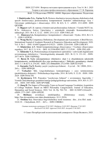 9. Дмитриенко Н.А., Юрина Е.Н. Процесс обучения иноязычному общению как способ формирования профессиональной компетентности студентов технического вуза // Universum: психология и образование. 2014. № 4(5). С. 5. -eISSN: 2311-6099. EDN: QEXJBR