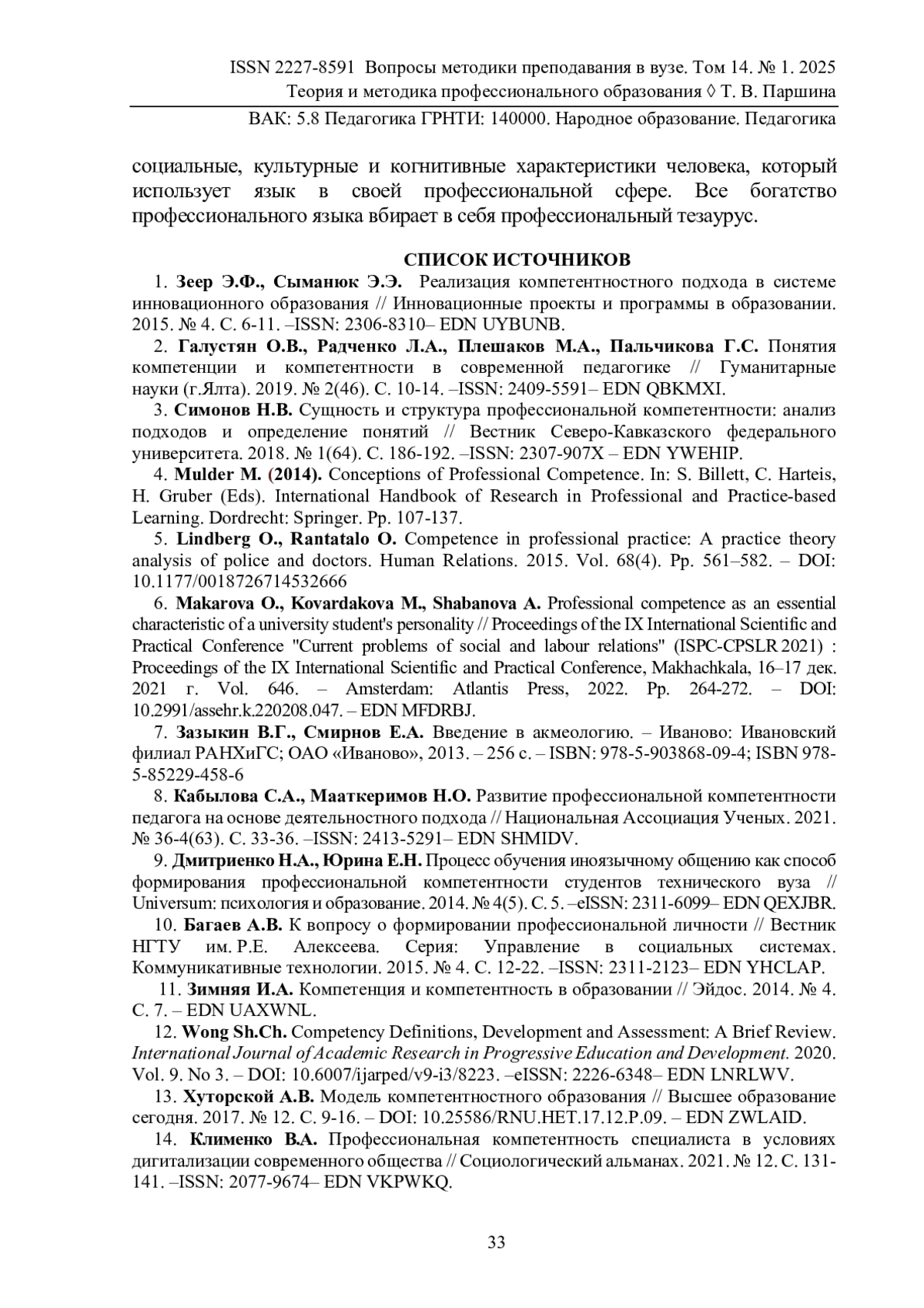 3. Симонов Н.В. Сущность и структура профессиональной компетентности: анализ подходов и определение понятий // Вестник Северо-Кавказского федерального университета. 2018. № 1(64). С. 186-192. -ISSN: 2307-907X. EDN: YWEHIP