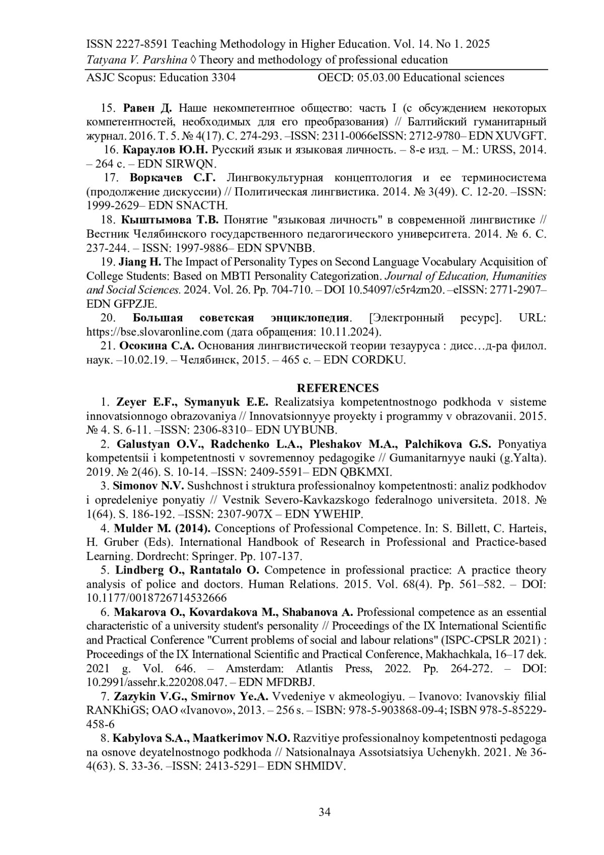 6. Makarova O., Kovardakova M., Shabanova A. Professional competence as an essential characteristic of a university student’s personality // Proceedings of the IX International Scientific and Practical Conference “Current problems of social and labour relations” (ISPC-CPSLR 2021): Proceedings of the IX International Scientific and Practical Conference, Makhachkala, 16-17 дек. 2021 г. Vol. 646. - Amsterdam: Atlantis Press, 2022. Pp. 264-272. -. DOI: 10.2991/assehr.k.220208.047 EDN: MFDRBJ