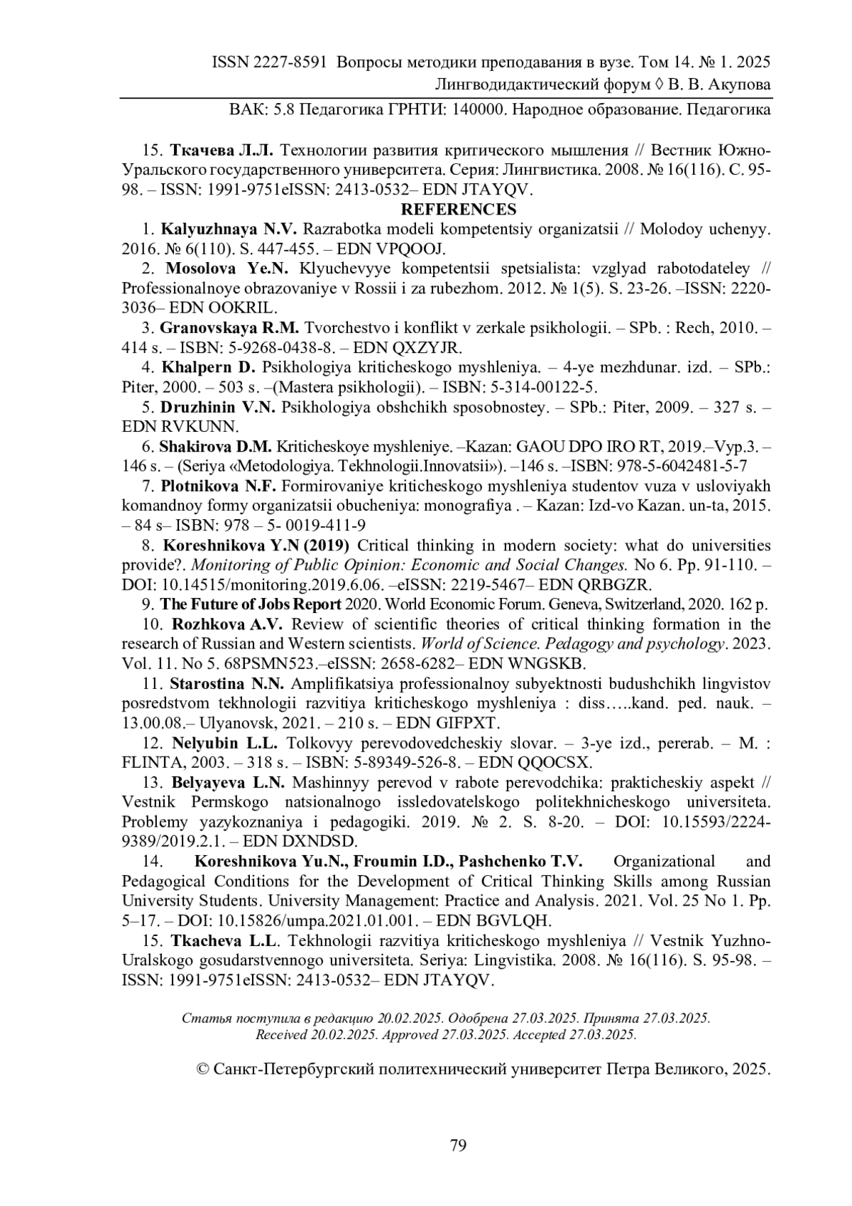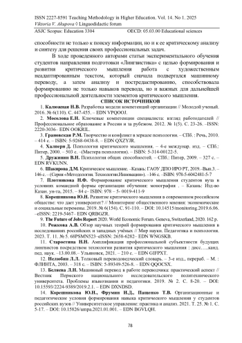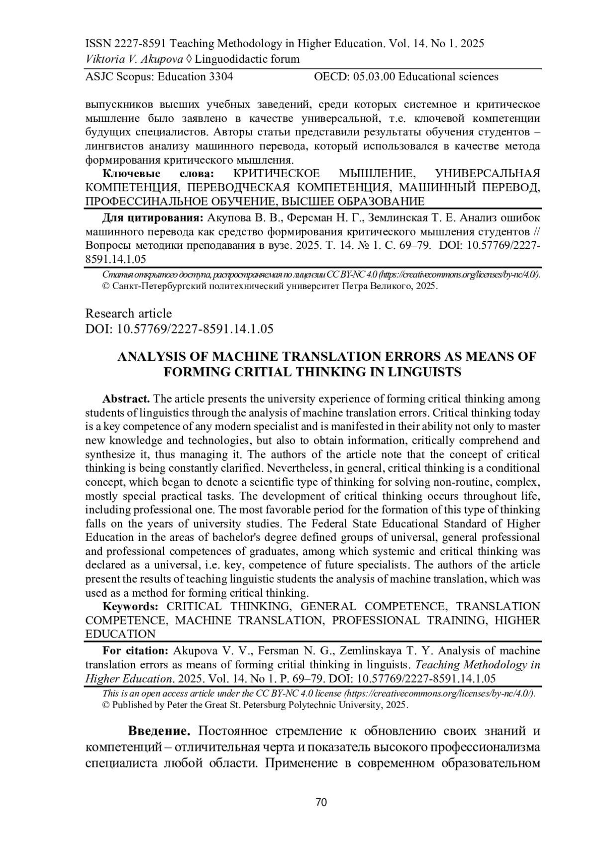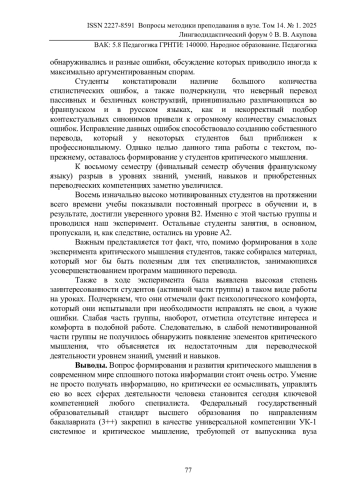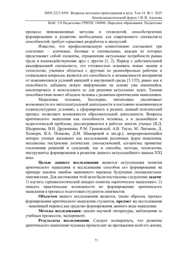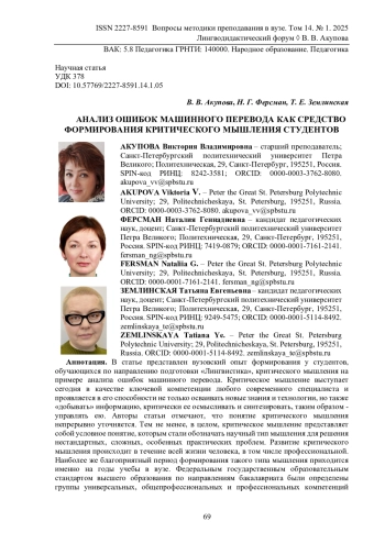 В статье представлен вузовский опыт формирования у студентов, обучающихся по направлению подготовки «Лингвистика», критического мышления на примере анализа ошибок машинного перевода. Критическое мышление выступает сегодня в качестве ключевой компетенции любого современного специалиста и проявляется в его способности не только осваивать новые знания и технологии, но также «добывать» информацию, критически ее осмысливать и синтезировать, таким образом - управлять ею. Авторы статьи отмечают, что понятие критического мышления непрерывно уточняется. Тем не менее, в целом, критическое мышление представляет собой условное понятие, которым стали обозначать научный тип мышления для решения нестандартных, сложных, особенных практических проблем. Развитие критического мышления происходит в течение всей жизни человека, в том числе профессиональной. Наиболее же благоприятный период формирования такого типа мышления приходится именно на годы учебы в вузе. Федеральным государственным образовательным стандартом высшего образования по направлениям бакалавриата были определены группы универсальных, общепрофессиональных и профессиональных компетенций выпускников высших учебных заведений, среди которых системное и критическое мышление было заявлено в качестве универсальной, т. е. ключевой компетенции будущих специалистов. Авторы статьи представили результаты обучения студентов – лингвистов анализу машинного перевода, который использовался в качестве метода формирования критического мышления