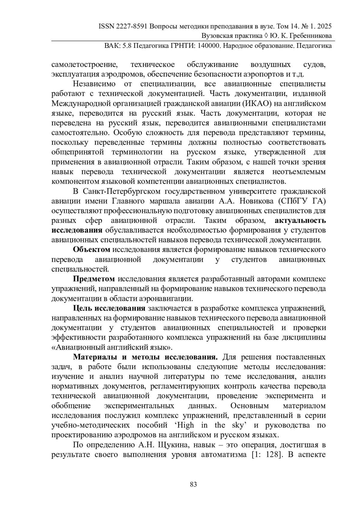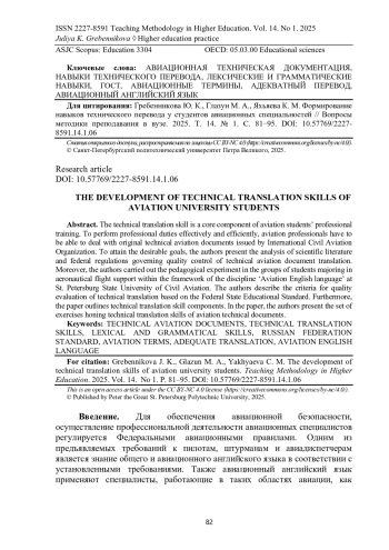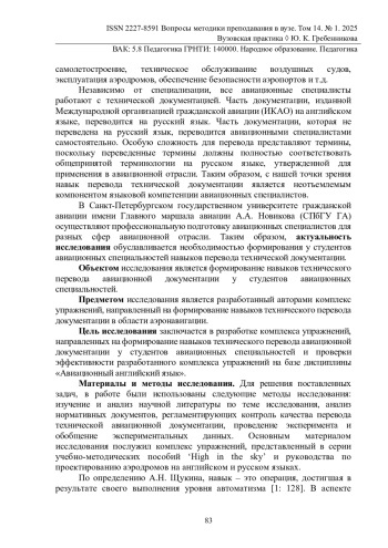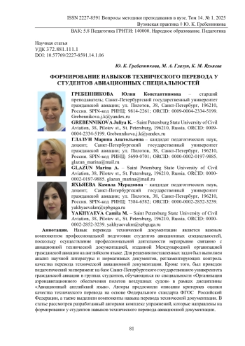 Навык перевода технической документации является важным компонентом профессиональной подготовки студентов авиационных специальностей, поскольку осуществление профессиональной деятельности неразрывно связанно с авиационной технической документацией, изданной Международной организацией гражданской авиации на английском языке. Для решения поставленных задач был выполнен анализ научной литературы и нормативных документов, регламентирующих контроль качества перевода технической авиационной документации. Кроме того, был проведен педагогический эксперимент на базе Санкт-Петербургского государственного университета гражданской авиации в группах студентов, обучающихся по специальности «Организация аэронавигационного обеспечения полетов воздушных судов» в рамках дисциплины «Авиационный английский язык». Авторы предложили описание критериев оценки качества технического перевода на основе Федерального стандарта ФГОС Российской Федерации, а также выделили компоненты навыка перевода технической документации. В статье рассмотрен разработанный авторами комплекс упражнений, которые направлены на формирование у студентов навыков технического перевода авиационной документации