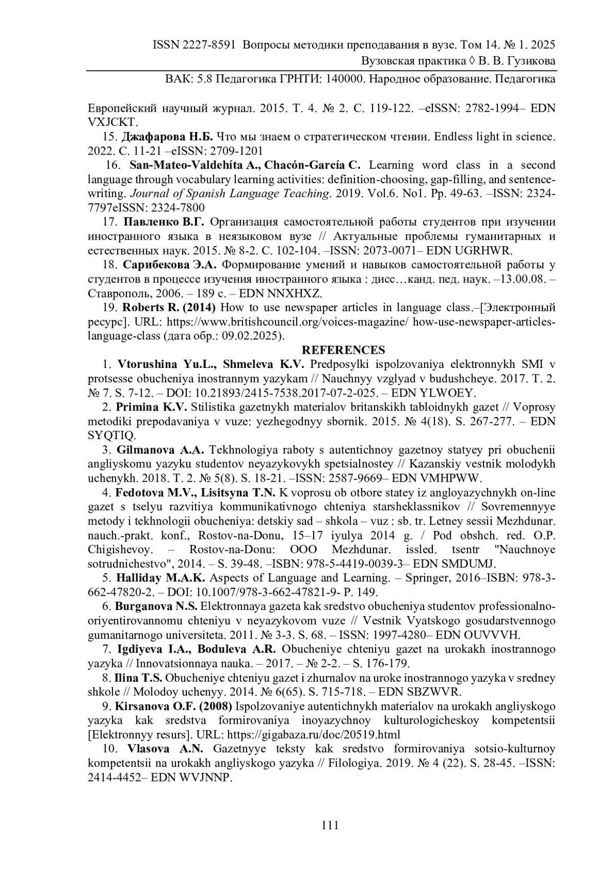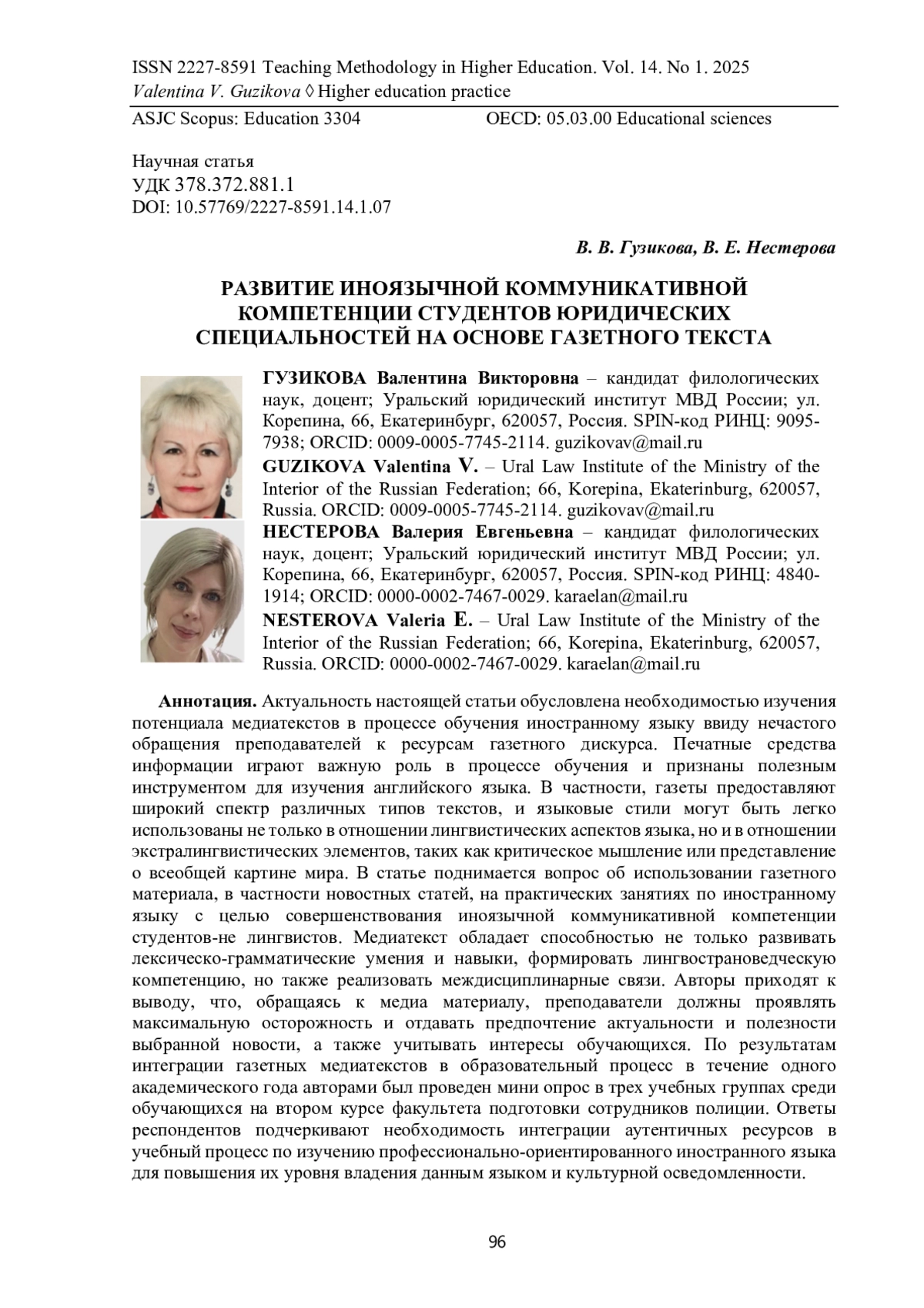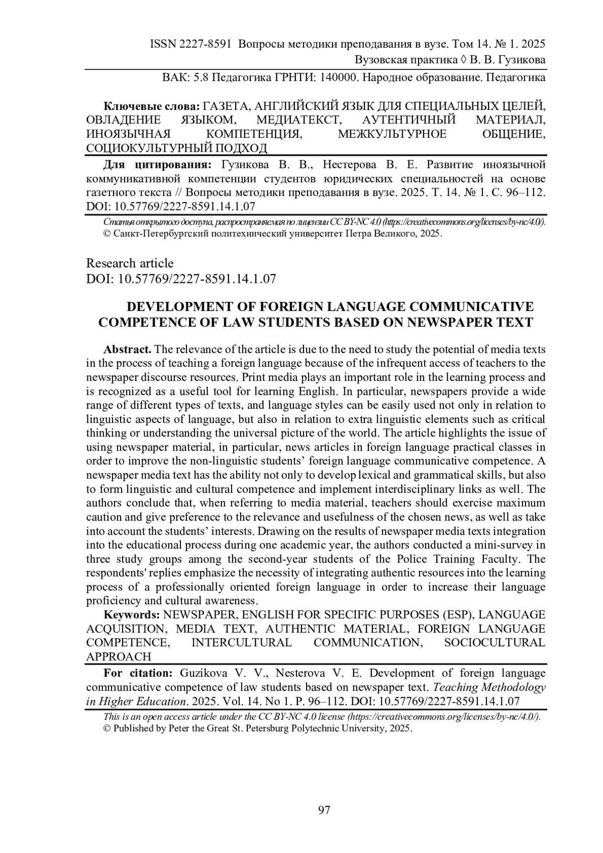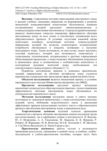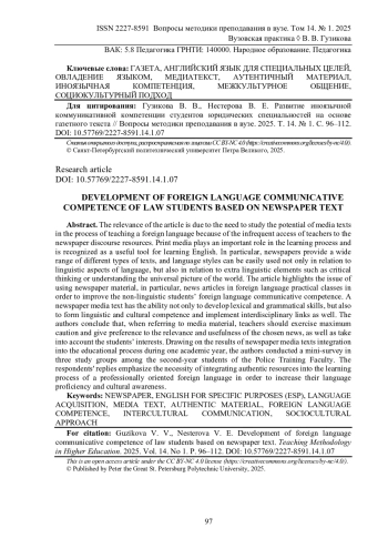Актуальность настоящей статьи обусловлена необходимостью изучения потенциала медиатекстов в процессе обучения иностранному языку ввиду нечастого обращения преподавателей к ресурсам газетного дискурса. Печатные средства информации играют важную роль в процессе обучения и признаны полезным инструментом для изучения английского языка. В частности, газеты предоставляют широкий спектр различных типов текстов, и языковые стили могут быть легко использованы не только в отношении лингвистических аспектов языка, но и в отношении экстралингвистических элементов, таких как критическое мышление или представление о всеобщей картине мира. В статье поднимается вопрос об использовании газетного материала, в частности новостных статей, на практических занятиях по иностранному языку с целью совершенствования иноязычной коммуникативной компетенции студентов-не лингвистов. Медиатекст обладает способностью не только развивать лексическо-грамматические умения и навыки, формировать лингвострановедческую компетенцию, но также реализовать междисциплинарные связи. Авторы приходят к выводу, что, обращаясь к медиа материалу, преподаватели должны проявлять максимальную осторожность и отдавать предпочтение актуальности и полезности выбранной новости, а также учитывать интересы обучающихся. По результатам интеграции газетных медиатекстов в образовательный процесс в течение одного академического года авторами был проведен мини опрос в трех учебных группах среди обучающихся на втором курсе факультета подготовки сотрудников полиции. Ответы респондентов подчеркивают необходимость интеграции аутентичных ресурсов в учебный процесс по изучению профессионально-ориентированного иностранного языка для повышения их уровня владения данным языком и культурной осведомленности