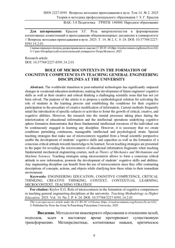 Развитие когнитивных компетенций, творческого и критического мышления будущих инженеров представляет собой комплексную научную проблему, которая на сегодня еще далека от решения, поскольку состоявшийся во всем мире переход к постиндустриальным технологиям значительно опередил трансформацию системы профессионального образования. Целью статьи является исследование методических решений для активизации роли студентов в процессе обучения, создания условий для их когнитивной вовлеченности в процесс творческого преобразования информации, придания личностного смысла получаемому учебному опыту. Существующие подходы часто предполагают введение специальных дисциплин или активностей для развития когнитивных компетенций, критического и творческого мышления. Однако исследования интеллектуальных мыслительных операций, лежащих в основе формирования когнитивной сферы, и психических процессов, происходящих при интериоризации учебной информации, показывают, что эти базовые интеллектуальные ресурсы личности могут задействоваться постоянно, при обучении любой дисциплине, необходимо лишь создавать условия для постоянного посильного интеллектуально-психического напряжения. Специальные методические приемы с использованием микроконтекстов, рассматриваемых с общенаучных позиций, позволяют формировать осознанное критическое отношение к новой информации, способствуют развитию когнитивных умений и навыков. В статье приводятся семь методических приемов раскрытия микроконтекстов фрагментов учебной информации при обучении общеинженерным дисциплинам механического направления – «Теоретической механике и теории механизмов и машин». Методические приемы с использованием микроконтекстов позволяют формировать осознанное критическое отношение к новой информации, способствует развитию когнитивных умений и навыков. Микроконтекст как способ контрастного описания объектов, понятий, действий при выяснении их отношений с ближайшим окружением, может использоваться при обучении любой инженерной дисциплине
